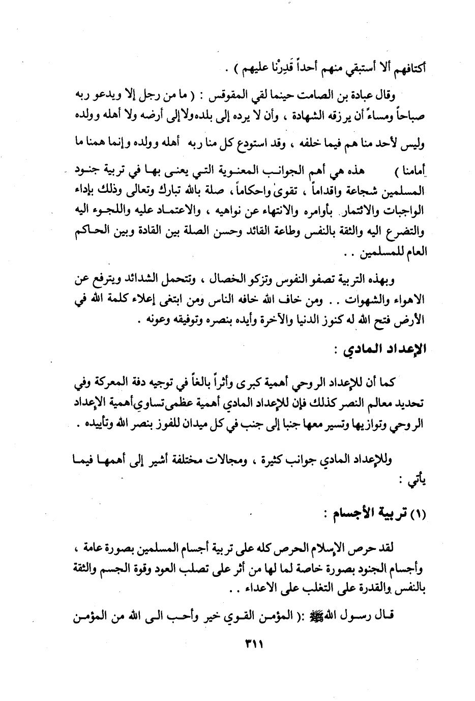 وقال عبادة بن الصامت حينما لقي المقوقس: "ما من رجل إلا ويدعو ربه صباحًا ومساء أن يرزقه الشهادة، وأن لا يرده إلى بلده ولا إلى أرضه ولا أهله وولده وليس لأحد منا هم فيما خلفه، وقد استودع كل منا ربه أهله وولده وإنما همنا ما أمامنا" هذه هي أهم الجوانب المعنوية التي يعنى بها في تربية جنود المسلمين شجاعة وإقدامًا. تقوى وإحكامًا، صلة بالله تبارك وتعالى وذلك بأداء الواجبات والائتمار بأوامره والانتهاء عن نواهيه، والاعتماد عليه واللجوء إليه والتضرع إليه والثقة بالنفس وطاعة القائد وحسن الصلة بين القادة وبين الحاكم العام للمسلمين..