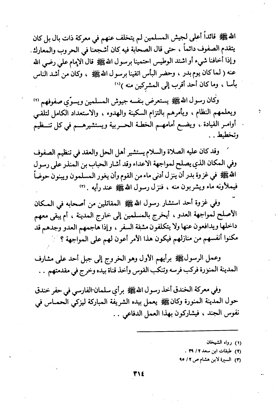 وكان رسول الله -صلى الله عليه وسلم- يستعرض بنفسه جيوش المسلمين ويسوي صفوفهم2 ويعلمهم النظام، ويأمرهم بالتزام السكينة والهدوء، والاستعداد الكامل لتلقي أوامر القيادة، ويضع أمامهم الخطة الحربية ويستشيرهم في كل تنظيم وتخطيط..