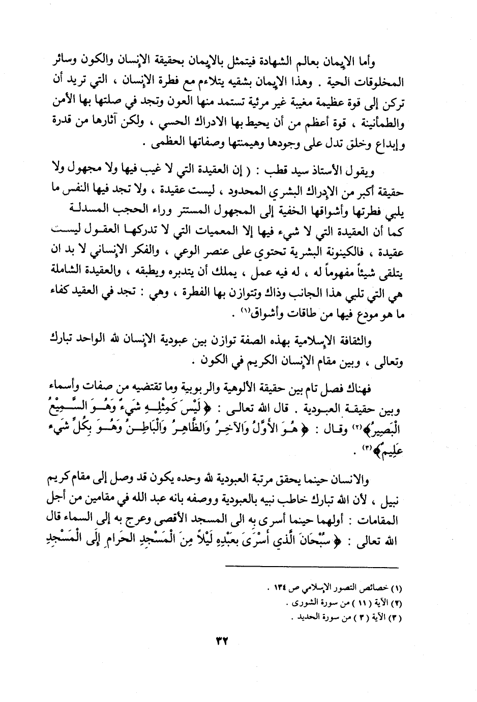 ويقول الأستاذ سيد قطب: "إن العقيدة التي لا غيب فيها ولا مجهول ولا حقيقة أكبر من الإدراك البشري المحدود، ليست عقيدة، ولا تجد فيها النفس ما يلبي فطرتها وأشواقها الخفية إلى المجهول المستتر وراء الحجب المسدلة كما أن العقيدة التي لا شيء فيها إلا المعميات التي لا تدركها العقول ليست عقيدة، فالكينونة البشرية تحتوي على عنصر الوعي، والفكر الإنساني لا بد أن يتلقى شيئا مفهوما له، له فيه عمل، يملك أن يتدبره ويطبقه، والعقيدة الشاملة هي التي تلبي هذا الجانب وذاك وتتوازن بها الفطرة، وهي: تجد في العقيدة كِفاء ما هو مودع فيها من طاقات وأشواق1.