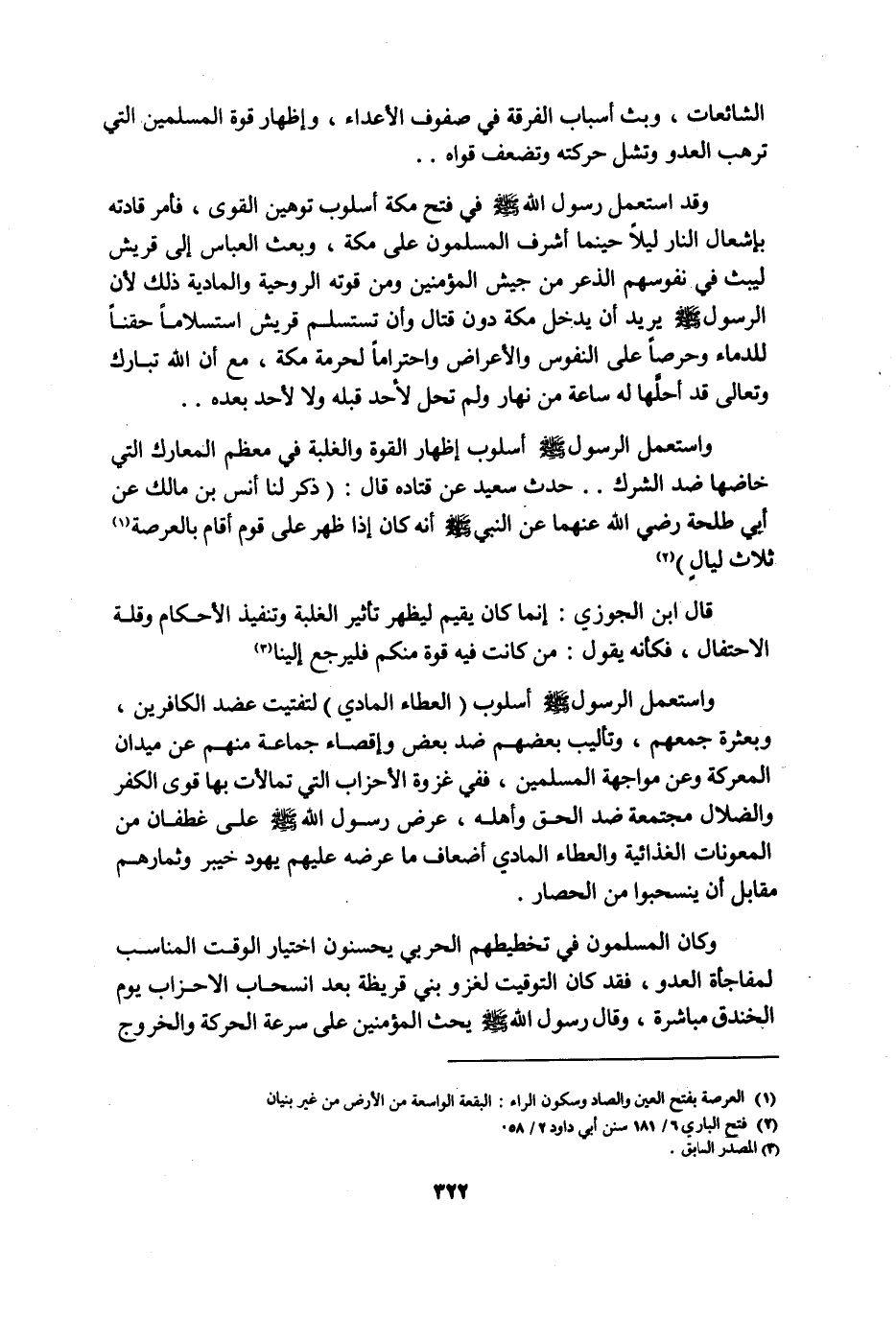 واستعمل الرسول -صلى الله عليه وسلم- أسلوب إظهار القوة والغلبة في معظم المعارك التي خاضها ضد الشرك.. حدَّث سعيد عن قتادة قال: "ذكر لنا أنس بن مالك عن أبي طلحة -رضي الله عنهما- عن النبي -صلى الله عليه وسلم- أنه كان إذا ظهر على قوم أقام بالعرصة1 ثلاث ليال"2.