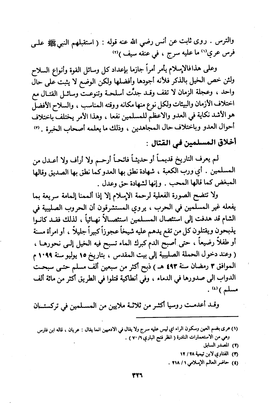 ولا تتضح الصورة الفعلية لرحمة الإسلام إلا إذا ألممنا إلمامة سريعة بما يفعله غير المسلمين في الحرب، يروي المستشرقون أن الحروب الصليبية في الشام قد هدفت إلى استئصال المسلمين استئصالًا نهائيًّا، لذلك فقد كانوا يذبحون ويقتلون كل من تقع يدهم عليه شيخًا عجوزًا كبيرًا جليلًا، أو امرأة مسنة أو طفلًا رضيعًا، حتى أصبح الدم كبرك الماء تسبح فيه الخيل إلى نحورها،
