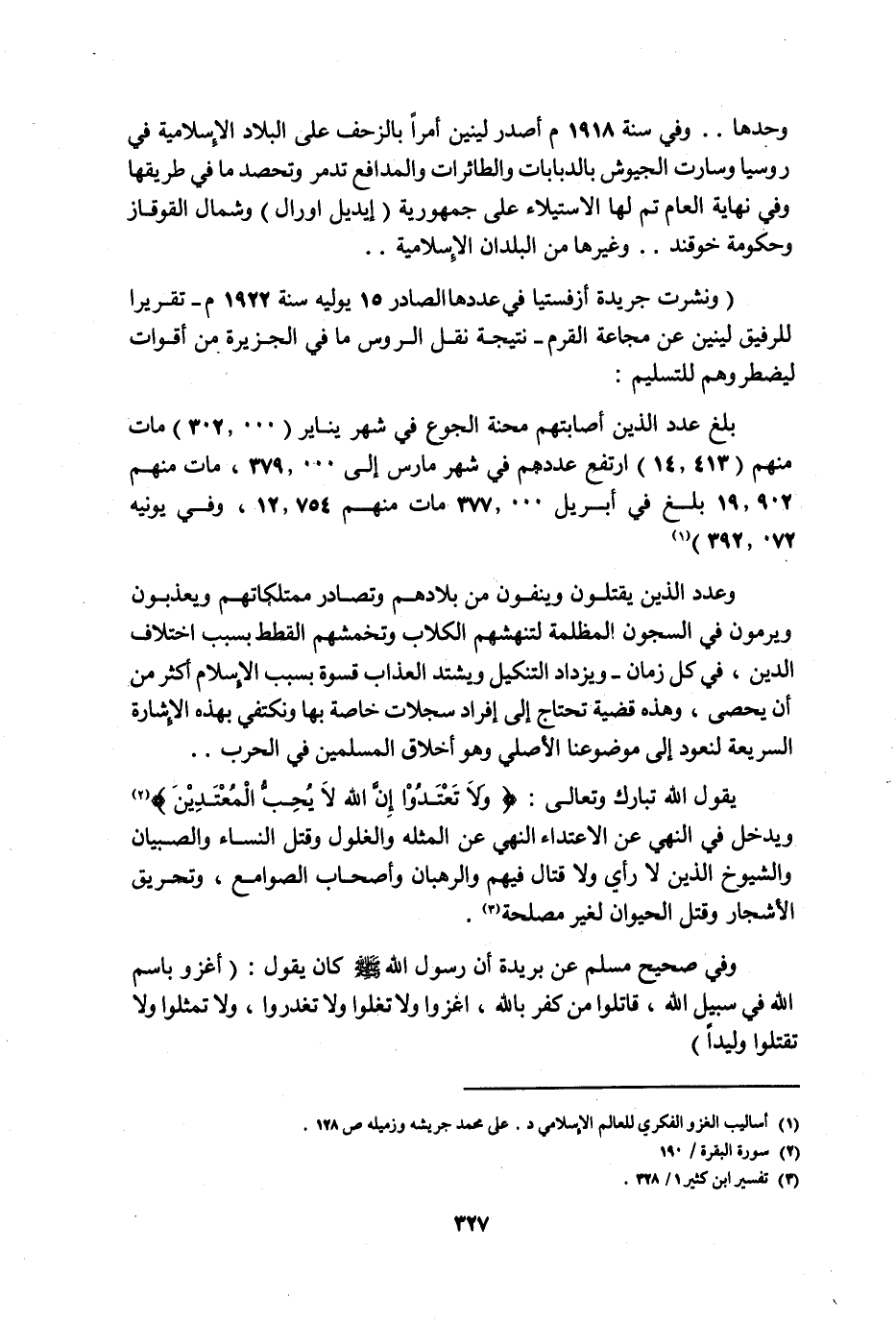 وحدها.. وفي سنة 1918م أصدر لينين أمرًا بالزحف على البلاد الإسلامية في روسيا وسارت الجيوش بالدبابات والطائرات والمدافع تدمر وتحصد ما في طريقها وفي نهاية العام تم لها الاستيلاء على جمهورية "إيديل أورال" وشمال القوقاز وحكومة خوقند.. وغيرها من البلدان الإسلامية..