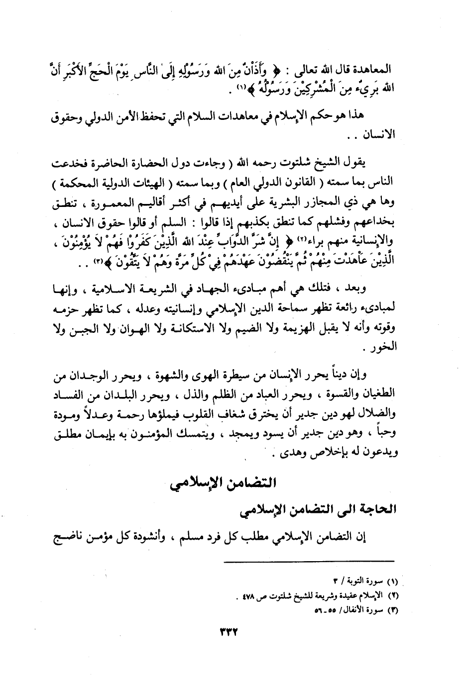 يقول الشيخ شلتوت -رحمه الله: "وجاءت دول الحضارة الحاضرة فخدعت الناس بما سمته "القانون الدولي العام" وبما سمته "الهيئات الدولية المحكمة" وها هي ذي المجازر البشرية على أيديهم في أكثر أقاليم المعمورة، تنطق بخداعهم وفشلهم كما تنطق بكذبهم إذا قالوا: السلم أو قالوا حقوق الإنسان، والإنسانية منهم براء2: {إِنَّ شَرَّ الدَّوَابِّ عِنْدَ اللَّهِ الَّذِينَ كَفَرُوا فَهُمْ لا يُؤْمِنُونَ، الَّذِينَ عَاهَدْتَ مِنْهُمْ ثُمَّ يَنقُضُونَ عَهْدَهُمْ فِي كُلِّ مَرَّةٍ وَهُمْ لا يَتَّقُونَ} 3.