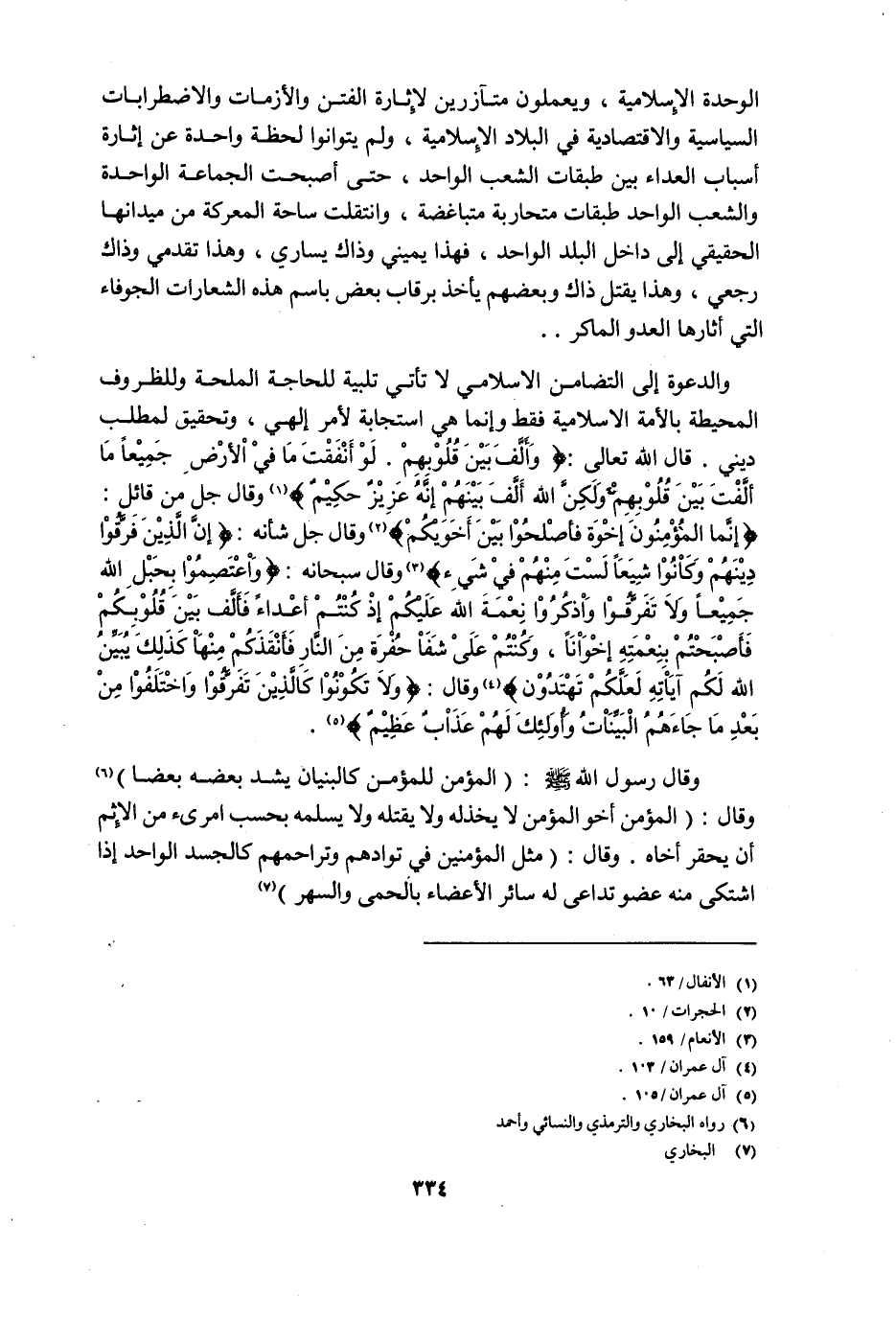 الوحدة الإسلامية، ويعملون متآزرين لإثارة الفتن والأزمات والاضطرابات السياسية والاقتصادية في البلاد الإسلامية، ولم يتوانوا لحظة واحدة عن إثارة أسباب العداء بين طبقات الشعب الواحد، حتى أصبحت الجماعة الواحدة والشعب الواحد طبقات متحاربة متباغضة، وانتقلت ساحة المعركة من ميدانها الحقيقي إلى داخل البلد الواحد، فهذا يميني وذاك يساري، وهذا تقدمي وذاك رجعي، وهذا يقتل ذاك وبعضهم يأخذ برقاب بعض باسم هذه الشعارات الجوفاء التي أثارها العدو الماكر..
