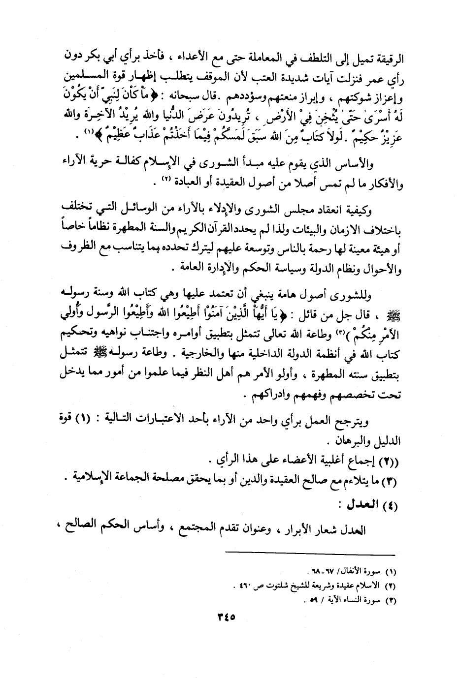 والأساس الذي يقوم عليه مبدأ الشورى في الإسلام كفالة حرية الآراء والأفكار ما لم تمس أصلا من أصول العقيدة أو العبادة2.