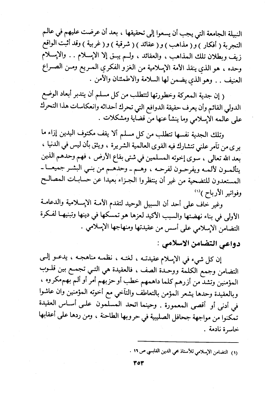 "إن جدية المعركة وخطورتها لتتطلب من كل مسلم أن يتدبر أبعاد الوضع الدولي القائم وأن يعرف حقيقة الدوافع التي تحرك أحداثه وانعكاسات هذا التحرك على عالمه الإسلامي وما ينشأ عنها من قضايا ومشكلات.