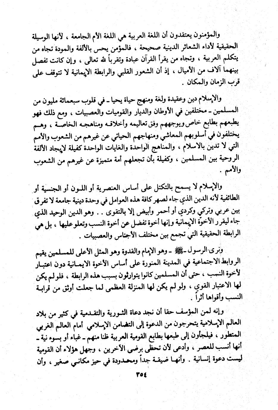 والمؤمنون يعتقدون أن اللغة العربية هي اللغة الأم الجامعة، لأنها الوسيلة الحقيقية لأداء الشعائر الدينية صحيحة، فالمؤمن يحس بالألفة والمودة تجاه من يتكلم العربية، وتجاه من يقرأ القرآن عبادة وتقربا لله تعالى، وإن كانت تفصل بينهما آلاف من الأميال، إذ إن الشعور القلبي والرابطة الإيمانية لا تتوقف على قرب الزمان والمكان.