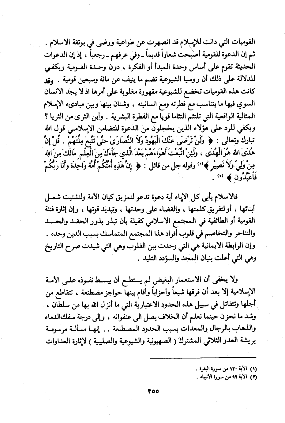 القوميات التي دانت للإسلام قد انصهرت عن طواعية ورضى في بوتقة الإسلام، ثم إن الدعوة للقومية أصبحت شعارا قديما -وفي عرفهم- رجعيا، إذ إن الدعوات الحديثة تقوم على أساس وحدة المبدأ أو الفكرة، دون وحدة القومية ويكفي للدلالة على ذلك أن روسيا الشيوعية تضم ما ينيف عن مائة وسبعين قومية. وقد كانت هذه القوميات تخضع للشيوعية مقهورة مغلوبة على أمرها إذ لا يجد الإنسان السوي فيها ما يتناسب مع فطرته ومع إنسانيته، وشتان بينها وبين مبادئ الإسلام المثالية الواقعية التي تلتئم التئاما قويا مع الفطرة البشرية. وأين الثرى من الثريا؟ ويكفي للرد على هؤلاء الذين يخجلون من الدعوة للتضامن الإسلامي قول الله تبارك وتعالى: {وَلَنْ تَرْضَى عَنْكَ الْيَهُودُ وَلا النَّصَارَى حَتَّى تَتَّبِعَ مِلَّتَهُمْ قُلْ إِنَّ هُدَى اللَّهِ هُوَ الْهُدَى وَلَئِنِ اتَّبَعْتَ أَهْوَاءَهُمْ بَعْدَ الَّذِي جَاءَكَ مِنَ الْعِلْمِ مَا لَكَ مِنَ اللَّهِ مِنْ وَلِيٍّ وَلا نَصِير} 1 وقوله جل من قائل: {إِنَّ هَذِهِ أُمَّتُكُمْ أُمَّةً وَاحِدَةً وَأَنَا رَبُّكُمْ فَاعْبُدُونِ} 2.