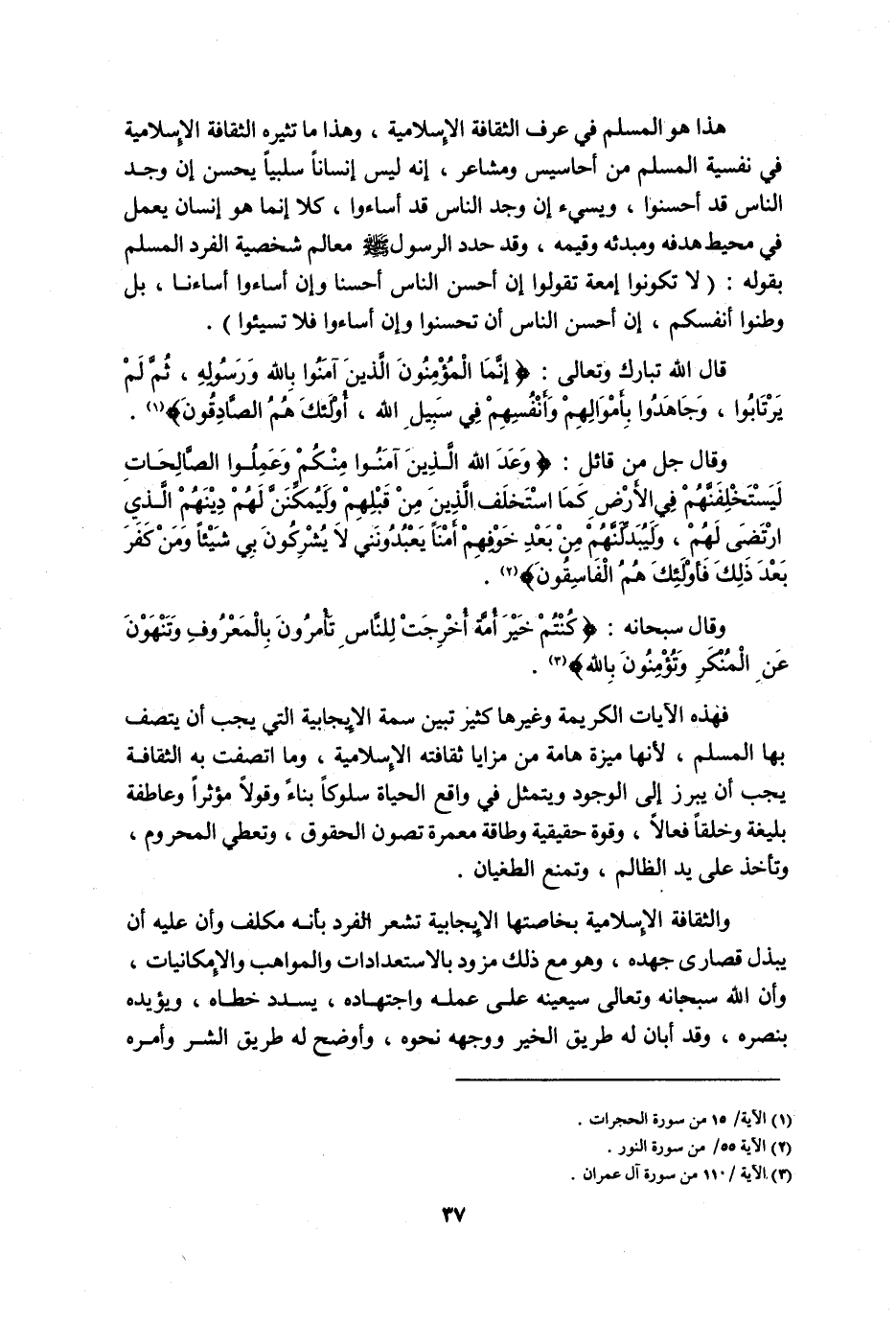 فهذه الآيات الكريمة وغيرها كثير تبين سمة الإيجابية التي يجب أن يتصف بها المسلم، لأنها ميزة مهمة من مزايا ثقافته الإسلامية، وما اتصفت به الثقافة يجب أن يبرز إلى الوجود ويتمثل في واقع الحياة سلوكا بناء وقولا مؤثرا وعاطفة بليغة وخلقا فعالا، وقوة حقيقية وطاقة معمرة تصون الحقوق، وتعطي المحروم، وتأخذ على يد الظالم، وتمنع الطغيان.