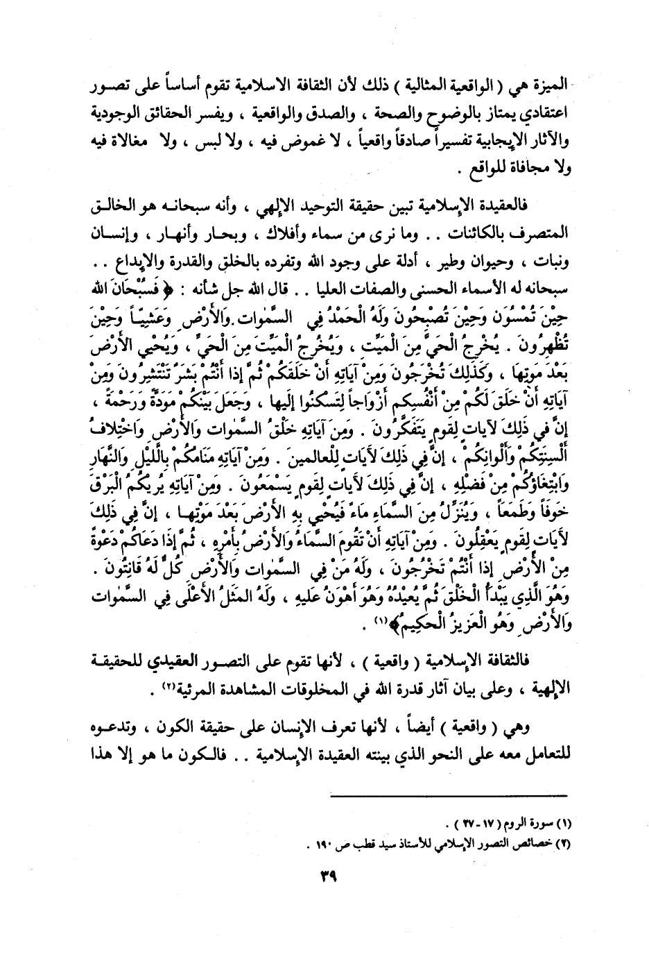 فالثقافة الإسلامية "واقعية"، لأنها تقوم على التصور العقيدي للحقيقة الإلهية، وعلى بيان آثار قدرة الله في المخلوقات المشاهدة المرئية2.