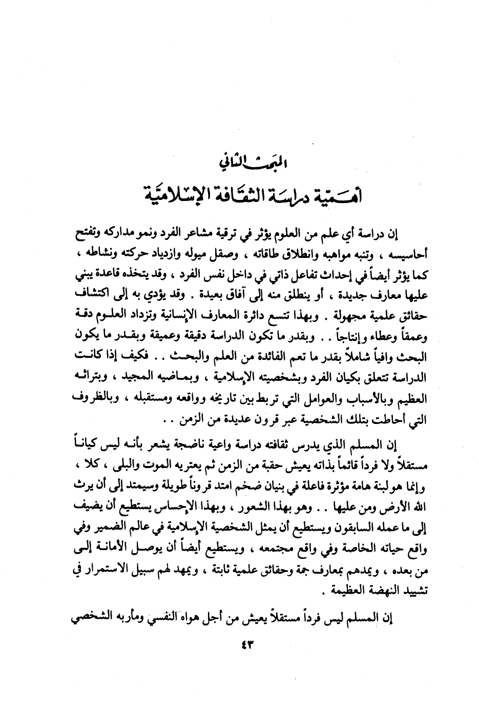 إن المسلم الذي يدرس ثقافته دراسة واعية ناضجة يشعر بأنه ليس كيانا مستقلا ولا فردا قائما بذاته يعيش حقبة من الزمن ثم يعتريه الموت والبلى، كلا، وإنما هو لبنة مهمة مؤثرة فاعلة في بنيان ضخم امتد قرونا طويلة وسيمتد إلى أن يرث الله الأرض ومن عليها.. وهو بهذا الشعور، وبهذا الإحساس يستطيع أن يضيف إلى ما عمله السابقون ويستطيع أن يمثل الشخصية الإسلامية في عالم الضمير وفي واقع حياته الخاصة وفي واقع مجتمعه، ويستطيع أيضا أن يوصل الأمانة إلى من بعده، ويمدهم بمعارف جمة وحقائق علمية ثابتة، ويمهد لهم سبيل الاستمرار في تشييد النهضة العظيمة.