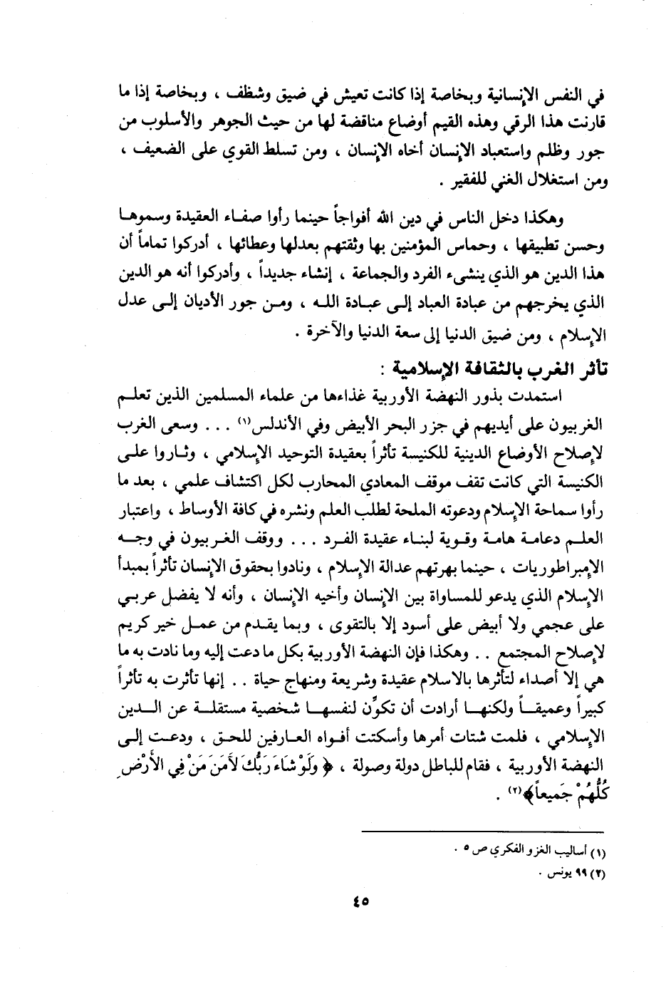 استمدت بذور النهضة الأوربية غذاءها من علماء المسلمين الذين تعلم الغربيون على أيديهم في جزر البحر الأبيض وفي الأندلس1 ... وسعى الغرب لإصلاح الأوضاع الدينية للكنيسة تأثرا بعقيدة التوحيد الإسلامي، وثاروا على الكنيسة التي كانت تقف موقف المعادي المحارب لكل اكتشاف علمي، بعد ما رأو سماحة الإسلام ودعوته الملحة لطلب العلم ونشره في كافة الأوساط، واعتبار العلم دعامة مهمة وقوية لبناء عقيدة الفرد ... ووقف الغربيون في وجه الإمبراطوريات، حينما بهرتهم عدالة الإسلام، ونادوا بحقوق الإنسان تأثرا بمبدأ الإسلام الذي يدعو للمساواة بين الإنسان وأخيه الإنسان، وأنه لا يفضل عربي على عجمي ولا أبيض على أسود إلا بالتقوى، وبما يقدم من عمل خير كريم لإصلاح المجتمع.. وهكذا فإن النهضة الأوربية بكل ما دعت إليه وما نادت به ما هي إلا أصداء لتأثرها بالإسلام عقيدة وشريعة ومنهاج حياة.. إنها تأثرت به تأثرا كبيرا وعميقا ولكنها أرادت أن تكوِّن لنفسها شخصية مستقلة عن الدين الإسلامي، فلمت شتات أمرها وأسكتت أفواه العارفين للحق، ودعت إلى النهضة الأوربية، فقام للباطل دولة وصولة: {وَلَوْ شَاءَ رَبُّكَ لَآَمَنَ مَنْ فِي الْأَرْضِ كُلُّهُمْ جَمِيعًا} 2.