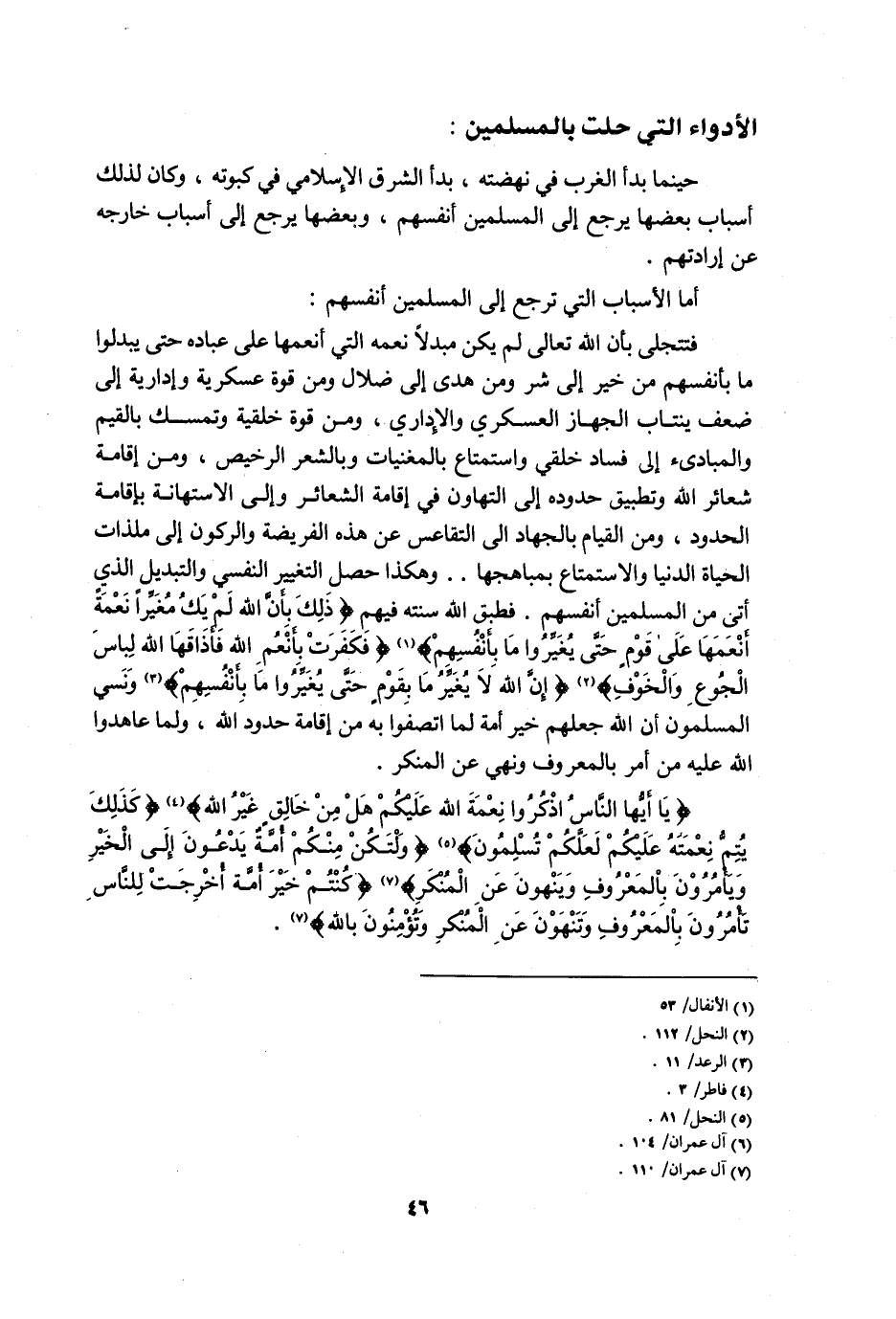 فتتجلى بأن الله تعالى لم يكن مبدلا نعمه التي أنعمها على عباده حتى يبدلوا ما بأنفسهم من خير إلى شر ومن هدى إلى ضلال ومن قوة عسكرية وإدارية إلى ضعف ينتاب الجهاز العسكري والإداري، ومن قوة خلقية وتمسك بالقيم والمبادئ إلى فساد خلقي واستمتاع بالمغنيات وبالشعر الرخيص، ومن إقامة شعائر الله وتطبيق حدوده إلى التهاون في إقامة الشعائر وإلى الاستهانة بإقامة الحدود، ومن القيام بالجهاد إلى التقاعس عن هذه الفريضة والركون إلى ملذات الحياة الدنيا والاستمتاع بمباهجها.. وهكذا حصل التغيير النفسي والتبديل الذي أتى من المسلمين أنفسهم. فطبق الله سنته فيهم: {ذَلِكَ بِأَنَّ اللَّهَ لَمْ يَكُ مُغَيِّرًا نِعْمَةً أَنْعَمَهَا عَلَى قَوْمٍ حَتَّى يُغَيِّرُوا مَا بِأَنْفُسِهِمْ} 1, {فَكَفَرَتْ بِأَنْعُمِ اللَّهِ فَأَذَاقَهَا اللَّهُ لِبَاسَ الْجُوعِ وَالْخَوْفِ} 2, {إِنَّ اللَّهَ لا يُغَيِّرُ مَا بِقَوْمٍ حَتَّى يُغَيِّرُوا مَا بِأَنْفُسِهِمْ} 3, ونسي المسلمون أن الله جعلهم خير أمة لما اتصفوا به من إقامة حدود الله، ولما عاهدوا الله عليه من أمر بالمعروف ونهي عن المنكر.