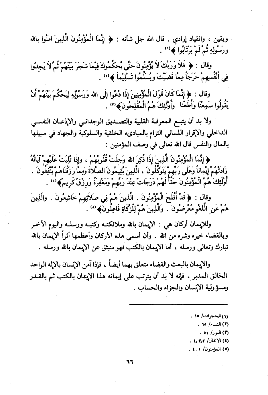 ويقين، وانقياد إرادي. قال الله جل شأنه: {إِنَّمَا الْمُؤْمِنُونَ الَّذِينَ آمَنُوا بِاللَّهِ وَرَسُولِهِ ثُمَّ لَمْ يَرْتَابُوا} 1.