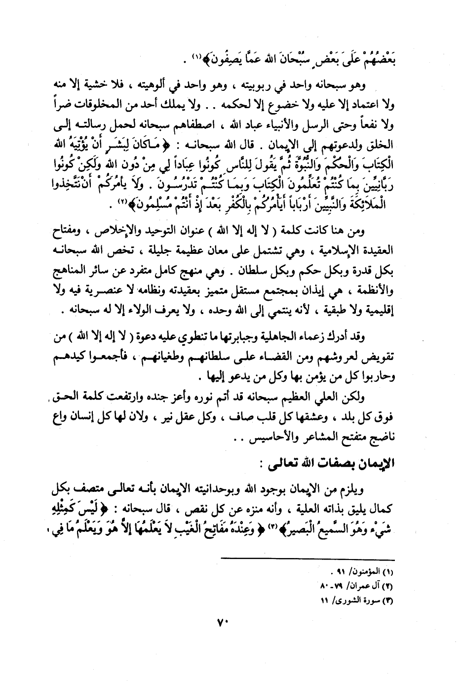 وهو سبحانه واحد في ربوبيته، وهو واحد في ألوهيته، فلا خشية إلا منه ولا اعتماد إلا عليه ولا خضوع إلا لحكمه.. ولا يملك أحد من المخلوقات ضرًّا ولا نفعًا وحتى الرسل والأنبياء عباد الله، اصطفاهم سبحانه لحمل رسالته إلى الخلق ولدعوتهم إلى الإيمان. قال الله سبحانه: {مَا كَانَ لِبَشَرٍ أَنْ يُؤْتِيَهُ اللَّهُ الْكِتَابَ وَالْحُكْمَ وَالنُّبُوَّةَ ثُمَّ يَقُولَ لِلنَّاسِ كُونُوا عِبَادًا لِي مِنْ دُونِ اللَّهِ وَلَكِنْ كُونُوا رَبَّانِيِّينَ بِمَا كُنْتُمْ تُعَلِّمُونَ الْكِتَابَ وَبِمَا كُنتُمْ تَدْرُسُونَ, وَلا يَأْمُرَكُمْ أَنْ تَتَّخِذُوا الْمَلائِكَةَ وَالنَّبِيِّينَ أَرْبَابًا أَيَأْمُرُكُمْ بِالْكُفْرِ بَعْدَ إِذْ أَنْتُمْ مُسْلِمُونَ} 2.