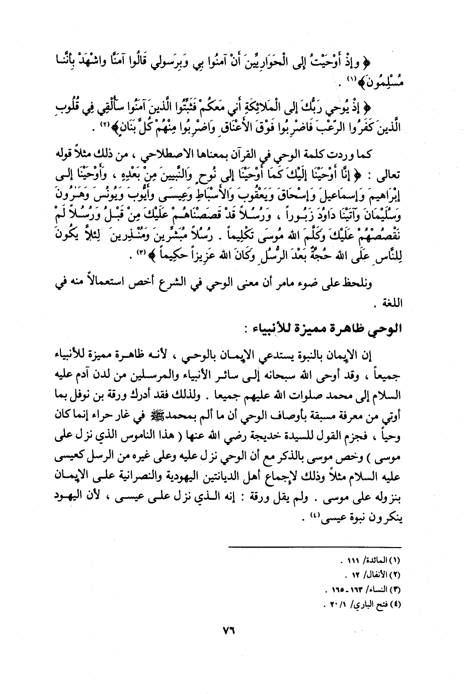 إن الإيمان بالنبوة يستدعي الإيمان بالوحي، لأنه ظاهرة مميزة للأنبياء جمعيًا، وقد أوحى الله سبحانه إلى سائر الأنبياء والمرسلين من لدن آدم عليه السلام إلى محمد صلوات الله عليهم جميعًا. ولذلك فقد أدرك ورقة بن نوفل بما أوتي من معرفة مسبقة بأوصاف الوحي أن ما ألم بمحمد -صلى الله عليه وسلم- في غار حراء إنما كان وحيًا، فجزم القول للسيدة خديجة -رضي الله عنها- "هذا الناموس الذي نزل على موسى" وخص موسى بالذكر مع أن الوحي نزل عليه وعلى غيره من الرسل كعيسى عليه السلام مثلا وذلك لإجماع أهل الديانتين اليهودية والنصرانية على الإيمان بنزوله على موسى. ولم يقل ورقة: إنه الذي نزل على عيسى، لأن اليهود ينكرون نبوة عيسى4.