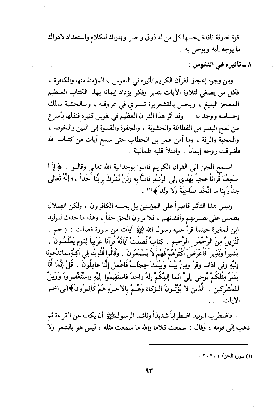 وليس هذا التأثير قاصرا على المؤمنين بل يحسه الكافرون، ولكن الضلال يطمس على بصيرتهم وأفئدتهم، فلا يرون الحق حقًّا، وهذا ما حدث للوليد ابن المغيرة حينما قرأ عليه رسول الله -صلى الله عليه وسلم- آيات من سورة فصلت: {حَم، تَنْزِيلٌ مِنَ الرَّحْمَنِ الرَّحِيمِ، كِتَابٌ فُصِّلَتْ آيَاتُهُ قُرْآنًا عَرَبِيًّا لِقَوْمٍ يَعْلَمُونَ، بَشِيرًا وَنَذِيرًا فَأَعْرَضَ أَكْثَرُهُمْ فَهُمْ لا يَسْمَعُونَ، وَقَالُوا قُلُوبُنَا فِي أَكِنَّةٍ مِمَّا تَدْعُونَا إِلَيْهِ وَفِي آذَانِنَا وَقْرٌ وَمِنْ بَيْنِنَا وَبَيْنِكَ حِجَابٌ فَاعْمَلْ إِنَّنَا عَامِلُونَ، قُلْ إِنَّمَا أَنَا بَشَرٌ مِثْلُكُمْ يُوحَى إِلَيَّ أَنَّمَا إِلَهُكُمْ إِلَهٌ وَاحِدٌ فَاسْتَقِيمُوا إِلَيْهِ وَاسْتَغْفِرُوهُ وَوَيْلٌ لِلْمُشْرِكِينَ، الَّذِينَ لا يُؤْتُونَ الزَّكَاةَ وَهُمْ بِالْآخِرَةِ هُمْ كَافِرُونَ} إلى آخر الآيات ...