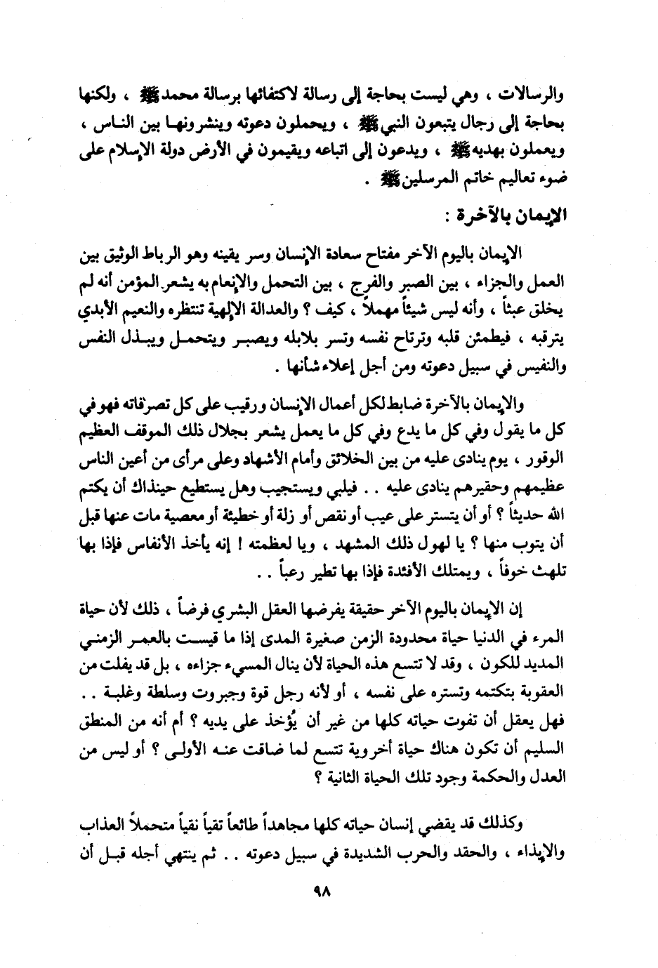 الإيمان باليوم الآخر مفتاح سعادة الإنسان وسر يقينه وهو الرباط الوثيق بين العمل والجزاء، بين الصبر والفرج، بين التحمل والإنعام به يشعر المؤمن أنه لم يخلق عبثًا، وأنه ليس شيئًا مهملًا، كيف؟ والعدالة الإلهية تنتظره والنعيم الأبدي يترقبه، فيطمئن قلبه وترتاح نفسه وتسر بلابله ويصبر ويتحمل ويبذل النفس والنفيس في سبيل دعوته ومن أجل إعلاء شأنها.