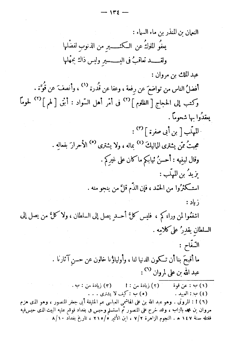 المهلب بن أبي صفرة: عجبت ممن يشتري المماليك بماله، ولا يشتري الأحرار بفعاله. وقال لبنيه: أحسن ثيابكم ما كان على غيركم. يزيد بن المهلب: استكثروا من الحمد، فإن الذم قلّ من ينجو منه. زياد: اشفعوا لمن وراءكم، فليس كل أحدٍ يصل إلى السلطان يقدر على كلامه. السفاح: ما أقبح بنا أن تكون الدنيا لنا، وأولياؤنا خالون عن حسن آثارنا. عبد الله بن علي لمروان