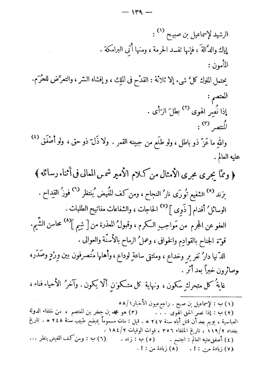 بزند الشفيع تورى نار النجاح، ومن كف المفيض ينتظر فوز القداح. الوسائل أقدام ذوي الحاجات، والشفاعات مفاتيح الطلبات. العفو عن المجرم من مواجب الكرم، وقبول المعذرة من شيم محاسن الشيم. قوة الجناح بالقوادم والخوافي، وعمل الرماح بالأسنة والعوالي. الدنيا دار تغريرٍ وخداع، وملتقى ساعةٍ لوداع، وأهلها متصرفون بين وردٍ وصدر، وصائرون خبراً بعد أثر. غاية كل متحركٍ سكون، ونهاية كل متكونٍ ألا يكون. وآخر الأحياء فناء،