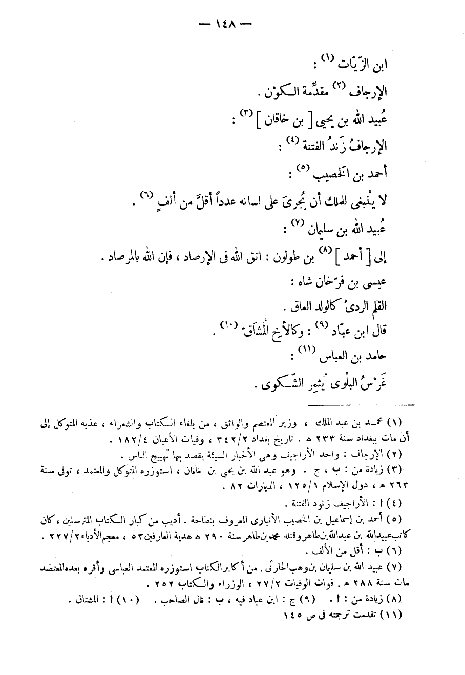 ابن الزيات: الإرجاف مقدمة الكون. عبيد الله بن يحيى بن خاقان: الإرجاف زند الفتنة. أحمد بن الخصيب: لا ينبغي للملك أي يجري على لسانه عدداً أقل من ألف. عبيد الله بن سليمان: إلى أحمد بن طولون: اتق الله في الإرصاد، فإن الله بالمرصاد. عيسى بن فرخان شاه: القلم الرديء كالولد العاق. قال ابن عباد: وكالأخ المشاق. حامد بن العباس: غرس البلوى يثمر الشكوى.