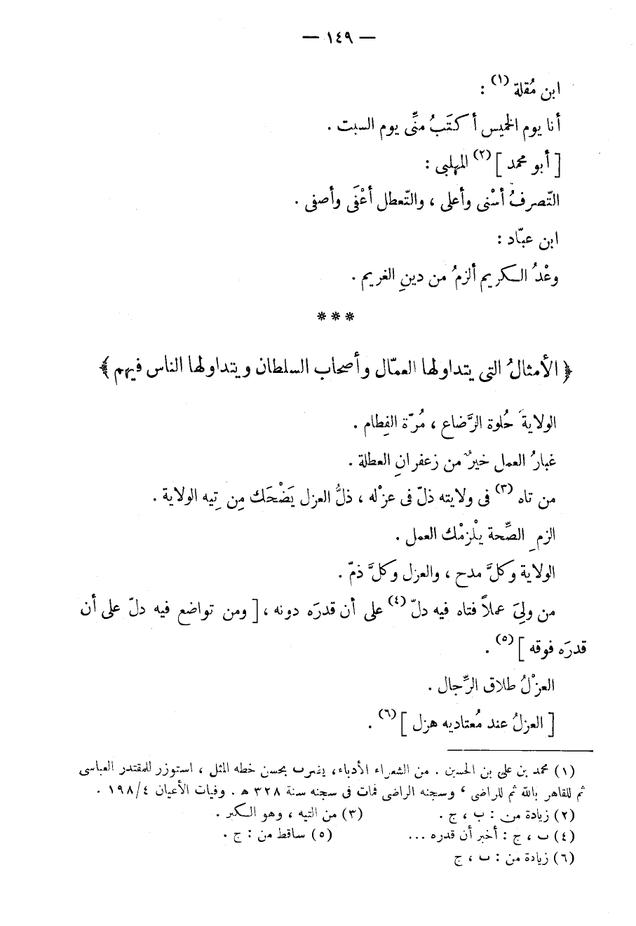 الولاية حلوة الرضاع، مرة الفطام. غبار العمل خيرٌ من زعفران العطلة. من تاه في ولايته ذل في عزله، ذل العزل يضحك من تيه الولاية. الزم الصحة يلزمك العمل. الولاية وكل مدح، والعزل وكل ذم. من ولي عملاً فتاه فيه دل على أن قدره دونه، ومن تواضع فيه دل على أن قدره فوقه. العزل طلاق الرجال. العزل عند معتاديه هزل.