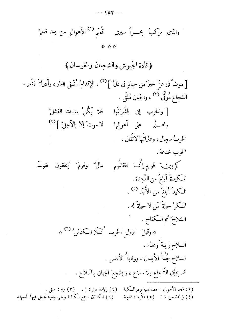 المكيدة أبلغ من النجدة. الكيد أبلغ من الأيد. المكر حيلة من لا حيلة له. السلاح ثم الكفاح. " وقبل نزول الحرب تملا الكنائن. " السلاح زينة وعدّة. السلاح جنة الأبدان، ووقاية الأنفس. قد يجبن الشجاع بلا سلاح، ويشجع الجبان بالسلاح.