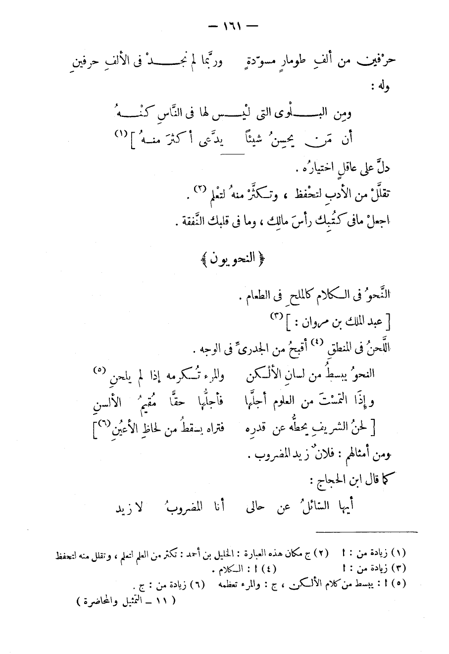 النحو في الكلام كالملح في الطعام. عبد الملك بن مروان: اللحن في المنطق أقبح من الجدري في الوجه.