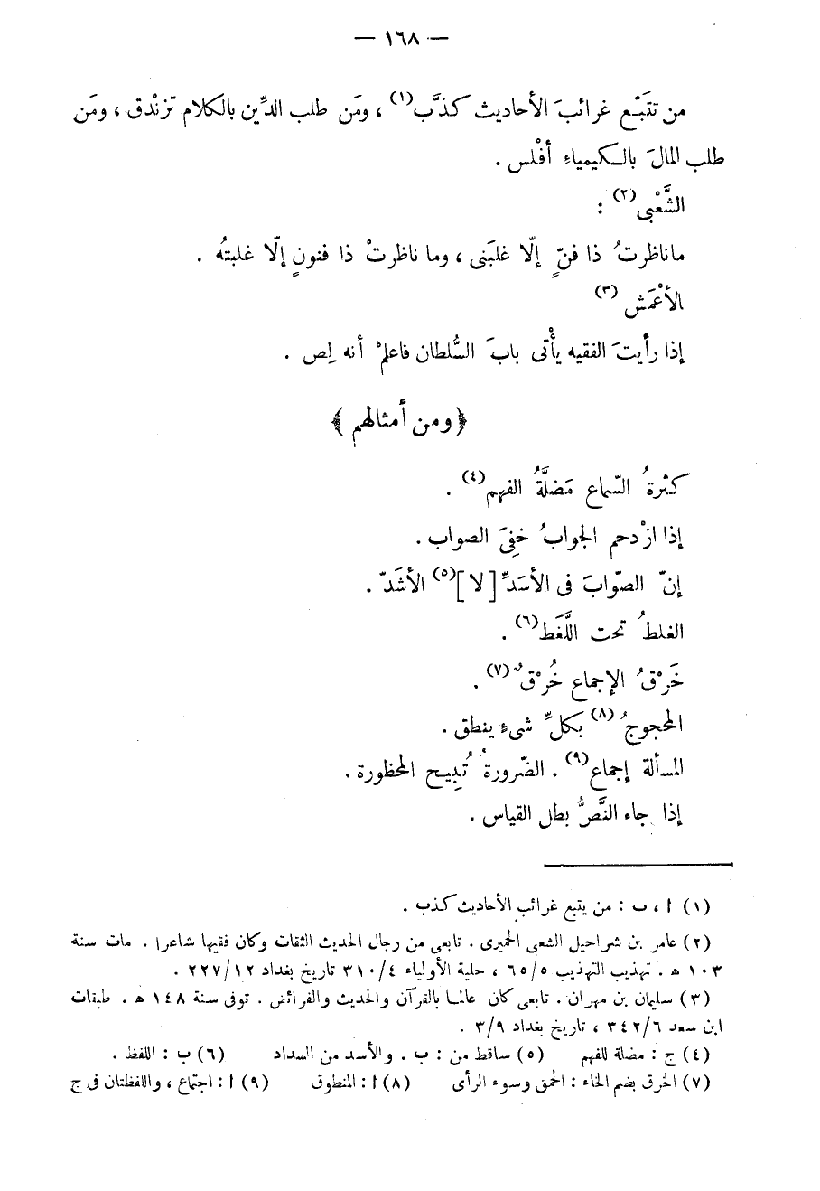 من تتبع غرائب الأحاديث كذّب، ومن طلب الدين بالكلام تزندق، ومن طلب المال بالكيمياء أفلس. الشعبي: ما ناظرت ذا فنٍ إلا غلبني، وما ناظرت ذا فنونٍ إلا غلبته. الأعمش: إذا رأيت الفقيه يأتي باب السلطان فاعلم أنه لص.