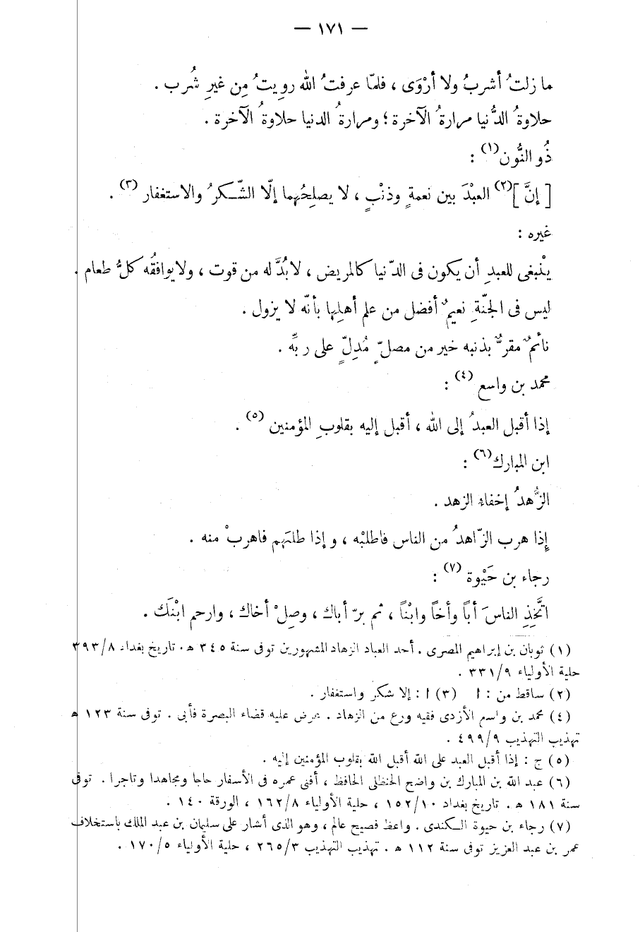 ما زلت اشرب ولا أروى، فلما عرفت الله رويت من غير شرب. حلاوة الدنيا مرارة الآخرة؛ ومرارة الدنيا حلاوة الآخرة. ذو النون: إن العبد بين نعمةٍ وذنبٍ، لا يصلحهما إلا الشكر والاستغفار. غيره: ينبغي للعبد أن يكون في الدنيا كالمريض، لا بد له من قوت، ولا يوافقه كل طعام. ليس في الجنة نعيمٌ أفضل من علم أهلها بأنه لا يزول. نائمٌ مقرٌ بذنبه خير من مصلٍ مدلٍ على ربه. محمد بن واسع: إذا أقبل العبد إلى الله، أقبل إليه بقلوب المؤمنين. ابن المبارك: الزهد إخفاء الزهد. إذا هرب الزاهد من الناس فاطلبه، وإذا طلبهم فاهرب منه. رجاء بن حيوة: اتخذ الناس أباً وأخاً وابناً، ثم برّ أباك، وصل أخاك، وارحم ابنك.