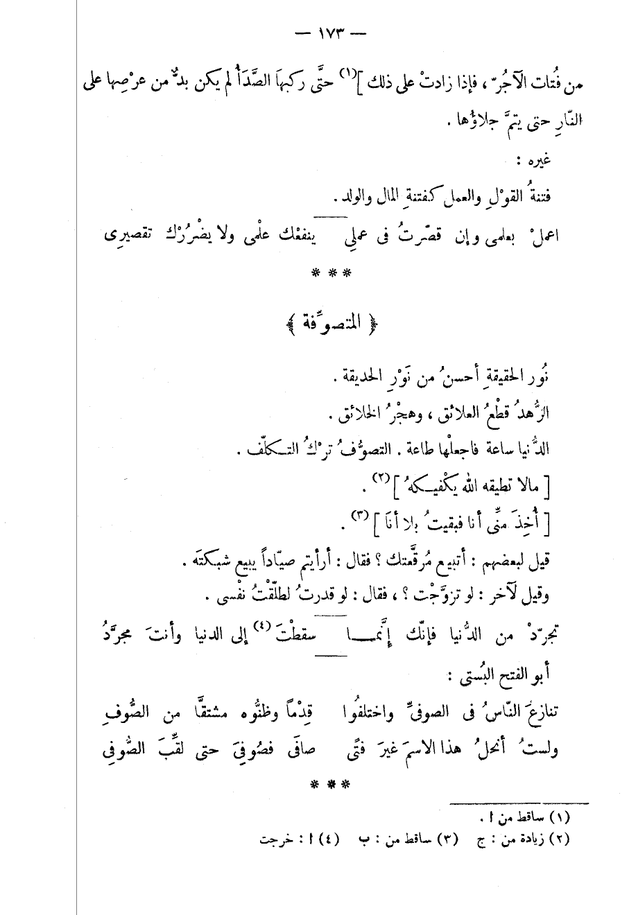 نور الحقيقة أحسن من نور الحديقة. الزهد قطع العلائق، وهجر الخلائق. الدنيا ساعة فاجعلها طاعة. التصوف ترك التكلف. مالا تطيقه الله يكفيكه. أخذ مني أنا فبقيت بلا انا. قيل لبعضهم: أتبيع مرقعتك؟ فقال: أرأيتم صياداً يبيع شبكته. وقيل لآخر: لو تزوجت؟، فقال: لو قدرت لطلقت نفسي.