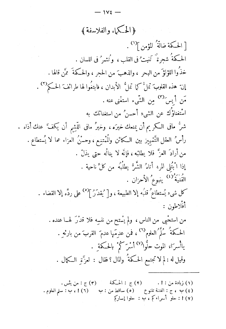 الحكمة ضالة المؤمن. الحكمة شجرةٌ تنبت في القلب، وتثمر في اللسان. خذوا اللؤلؤ من البحر، والذهب من الحجر، والحكمة ممن قالها. إن هذه القلوب تمل كما تمل الأبدان، فابتغوا لها طرائف الحكم. من أيس من الشيء استغنى عنه. استغناؤك عن الشيء أحسن من استغناؤك به. شر ما في الكريم أن يمنعك خيره، وخير ما في اللئيم أن يكف عنك أذاه. رأس العقل التمييز بين الكائن والممتنع، وحسن العزاء عما لا يستطاع. من أراد العز فلا يطلبه، فإنه لا يناله حتى يذل. إذا ابتلي المرء أتاه الشر يطلبه من كل ناحية. القنية ينبوع الأحزان. كل شيءٍ يستطاع قلبه إلا الطبيعة، ويقدر على رده إلا القضاء. أفلاطون: من استحيى من الناس، ولم يستح من نفسه فلا قدر لها عنده. الحكمة سلم العلوم، فمن عدمها عدم القرب من بارئه. يا أسراء الموت حلوا أسركم بالحكمة. وقيل له: لم لا تجتمع الحكمة والمال؟ فقال: لعزة الكمال.