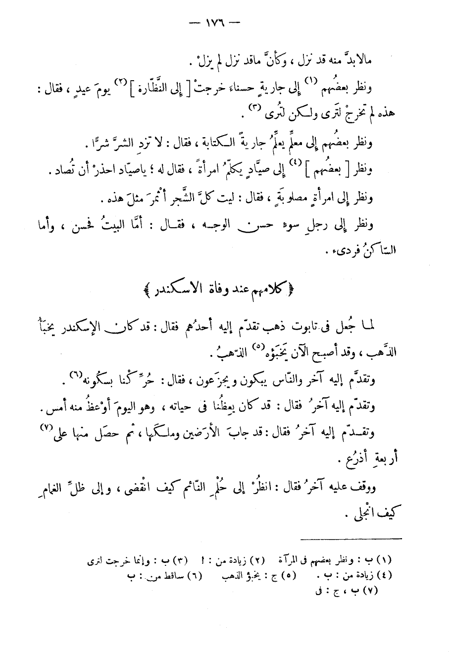 ما لا بد منه قد نزل، وكأن ما قد نزل لم يزل. ونظر بعضهم إلى جاريةٍ حسناء خرجت إلى النظارة يوم عيدٍ، فقال: هذه لم تخرج لترى ولكن لترى. ونظر بعضهم إلى معلم يعلم جاريةً الكتابة، فقال: لا تزد الشر شراً. ونظر بعضهم إلى صيادٍ يكلم امرأةً، فقال له؛ يا صياد إحذر أن تصاد. ونظر إلى امرأةٍ مصلوبة، فقال: ليت كل الشجر أثمر مثل هذه. ونظر إلى رجل سوءٍ حسن الوجه، فقال: أما البيت فحسن، وأما الساكن فرديء.