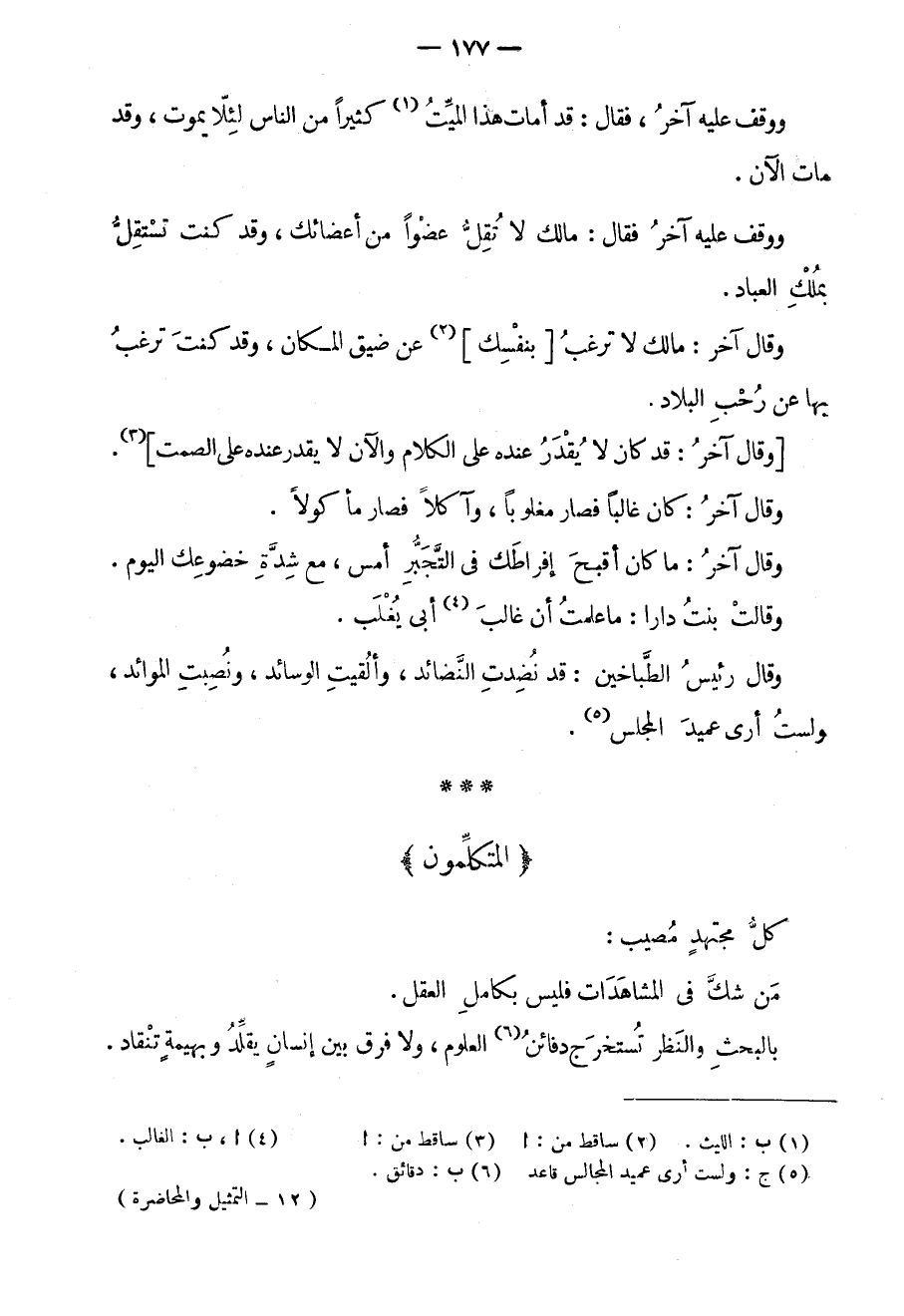 كل مجتهدٍ مصيب: من شك في المشاهدات فليس بكامل العقل. بالبحث والنظر تستخرج دفائن العلوم، ولا فرق بين إنسانٍ يقلد وبهيمةٍ تنقاد.