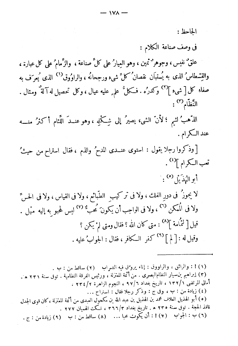 الجاحظ: في وصف صناعة الكلام: علقٌ نفيس، وجوهرٌ ثمين، وهو العيار على كل صناعة، والزمام على كل عبارة، والقسطاس الذي به يستبان نقصان كل شيءٍ ورجحانه، والراووق الذي يعرف به صفاء كل شيءٍ وكدره. فكل علمٍ عليه عيال، وكل تحصيل له آلةٌ ومثال. النظام: الذهب لئيم، لأن الشيء يصير إلى شكله، وهو عند اللئام أكثر منه عند الكرام. وذكروا رجلاً يقول: استوي عند المدح والذم، فقال استراح من حيث تعب الكرام. أبو الهذيل: لا يجوز في دور الفلك، ولا في تركيب الطبائع، ولا في القياس، ولا في الحس، ولا في الممكن، ولا في الواجب أن يكون محبٌ ليس لمحبوبه إليه ميل. قيل لثمامة: متى كان الله؟ فقال ومتى لم يكن؟ وقيل له: لم كفر الكافر؟ فقال: الجواب عليه.