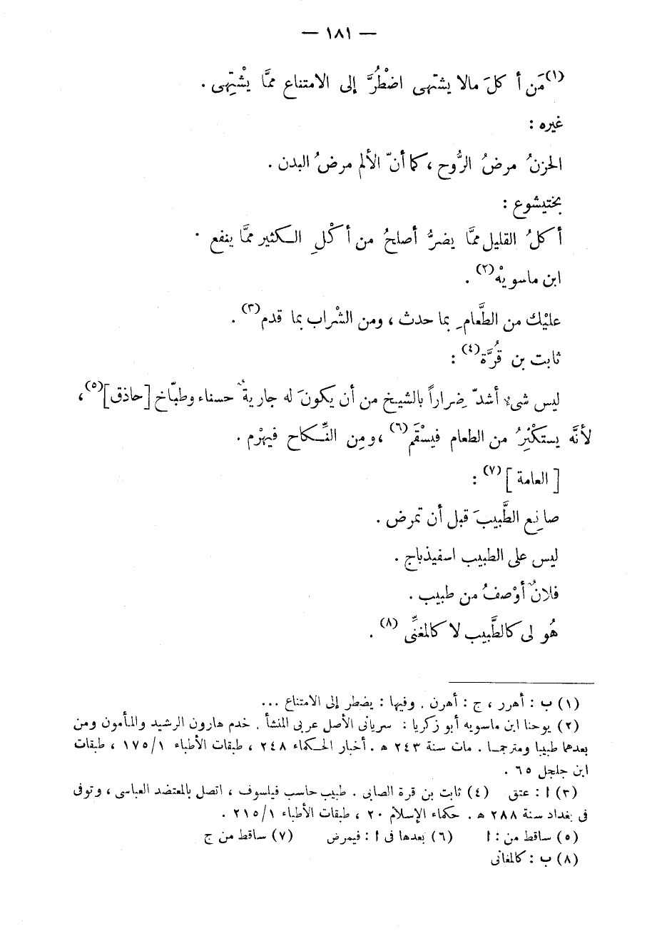 من أكل ما لا يشتهي اضطر إلى الإمتناع مما يشتهي. غيره: الحزن مرض الروح، كما أن الألم مرض البدن. بختيشوع: أكل القليل مما يضر أصلح من أكل الكثير مما ينفع. ابن ماسويه: عليك من الطعام بما حدث، ومن الشراب بما قدم. ثابت بن قرة: ليس شيء أشد ضراراً بالشيخ من أن يكون له جاريةٌ حسناء وطباخ حاذق، لأنه يستكثر من الطعام فيسقم، ومن النكاح فيهرم. العامة: صانع الطبيب قبل أن تمرض. ليس على الطبيب اسفيذباج. فلانٌ أوصف من طبيب. هو لي كالطبيب لا كالمغني.