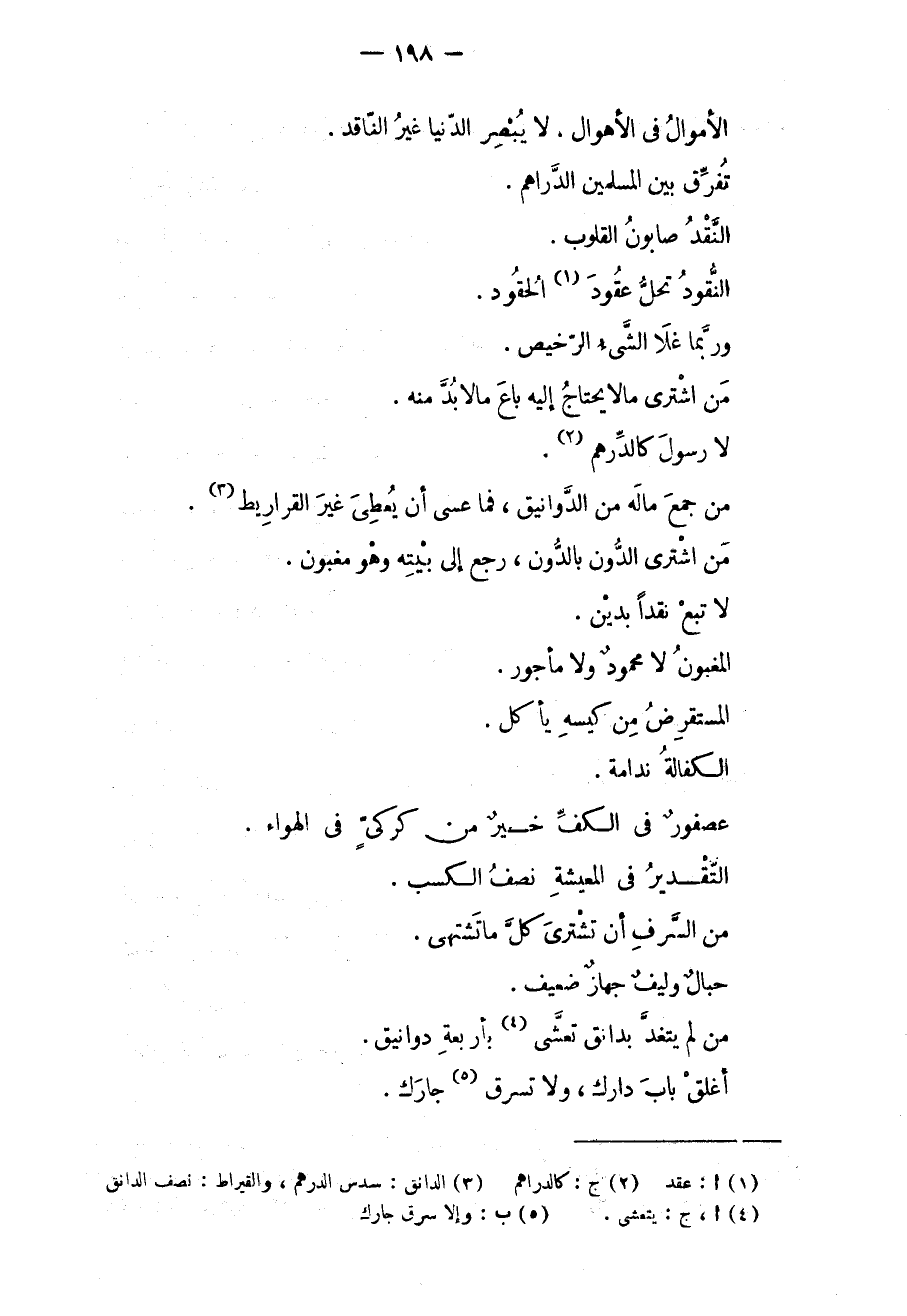 الأموال في الأهوال. لا يبصر الدنيا غير الناقد. تفرق بين المسلمين الدراهم. النقد صابون القلوب. النقود تحل عقود الحقود. وربما غلا الشيء الرخيص. من اشترى مالا يحتاج إليه باع ما لا بد منه. لا رسول كالدرهم. من جمع ماله من الدوانيق، فما عسى أن يعطي غير القراريط. من اشترى الدون بالدون، رجع إلى بيته وهو مغبون. لا تبع نقداً بدين. المغبون لا محمودٌ ولا مأجور. المستقرض من كيسه يأكل. الكفالة ندامة. عصفور في الكف خيرٌ من كركيٍّ في الهواء. التقدير في المعيشة نصف الكسب. من السرف أن تشتري كل ما تشتهي. حبالٌ وليفٌ جهازٌ ضعيف. من لم يتغد بدانق تعشى بأربعة دوانيق. أغلق باب دارك، ولا تسرق جارك.