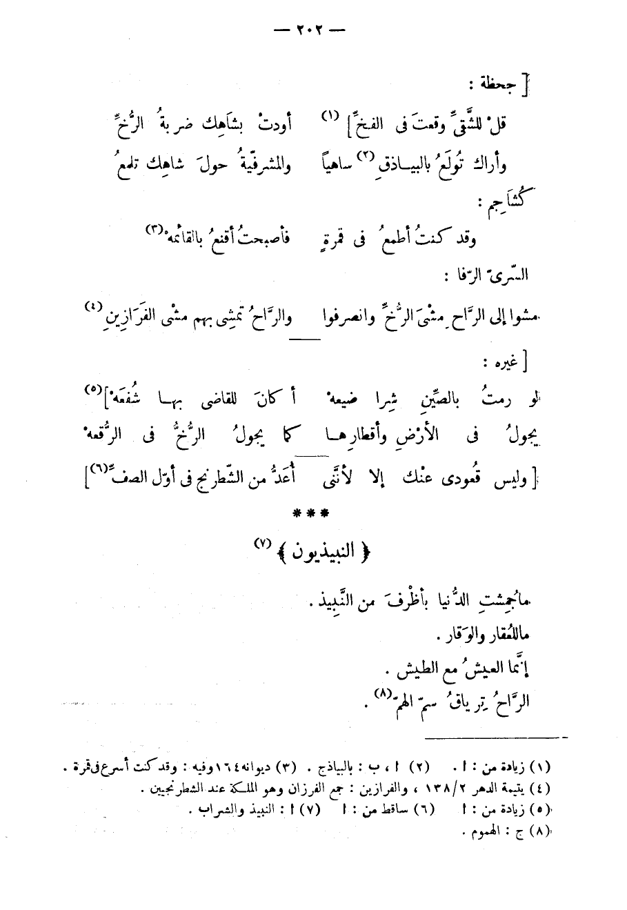 ما جمشت الدنيا بأظرف من النبيذ. ما للعقار والوقار. إنما العيش مع الطيش. الراح ترياق سم الهم.