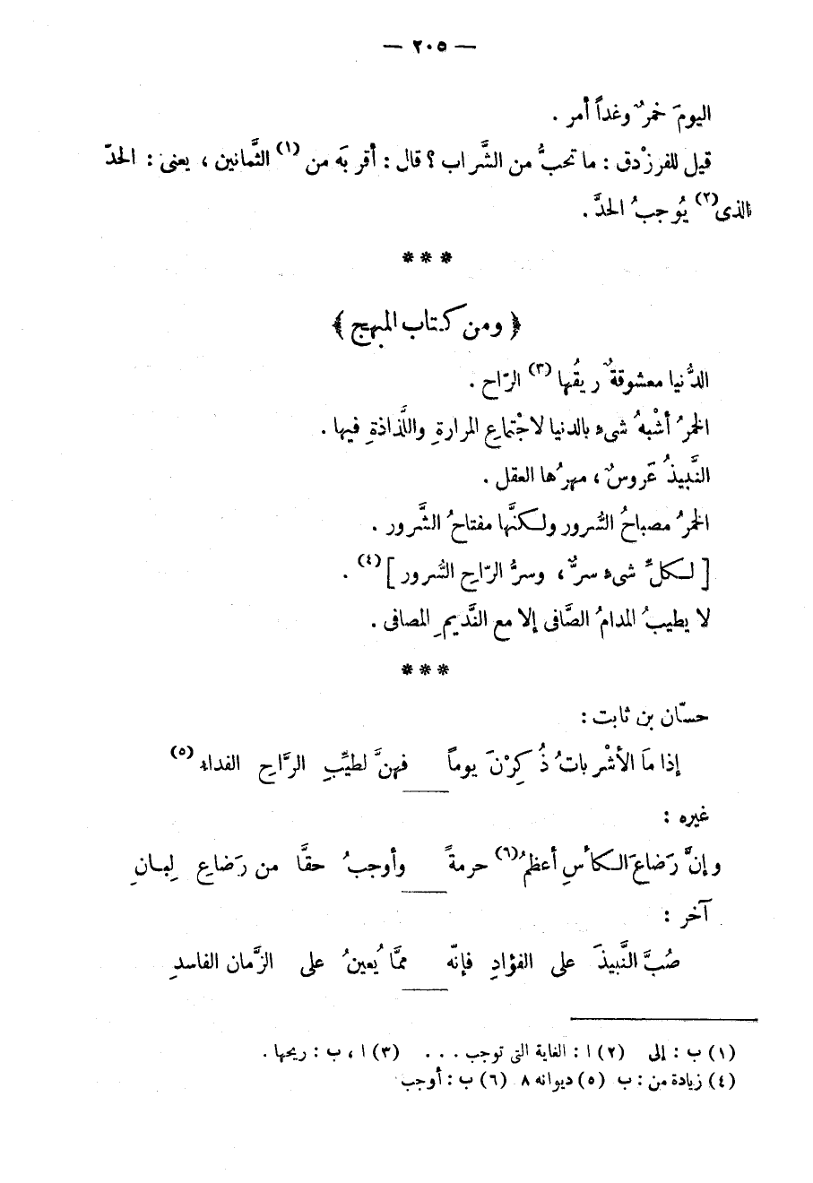 الدنيا معشوقةٌ ريقها الراح. الخمر أشبه شيء بالدنيا لاجتماع المرارة واللذاذة فيها. النبيذ عروسٌ، مهرها العقل. الخمر مصباح السرور ولكنها مفتاح الشرور. لكل شيءٍ سرٌ، وسر الراح السرور. لا يطيب المدام الصافي إلا مع النديم المصافي. حسان بن ثابت: