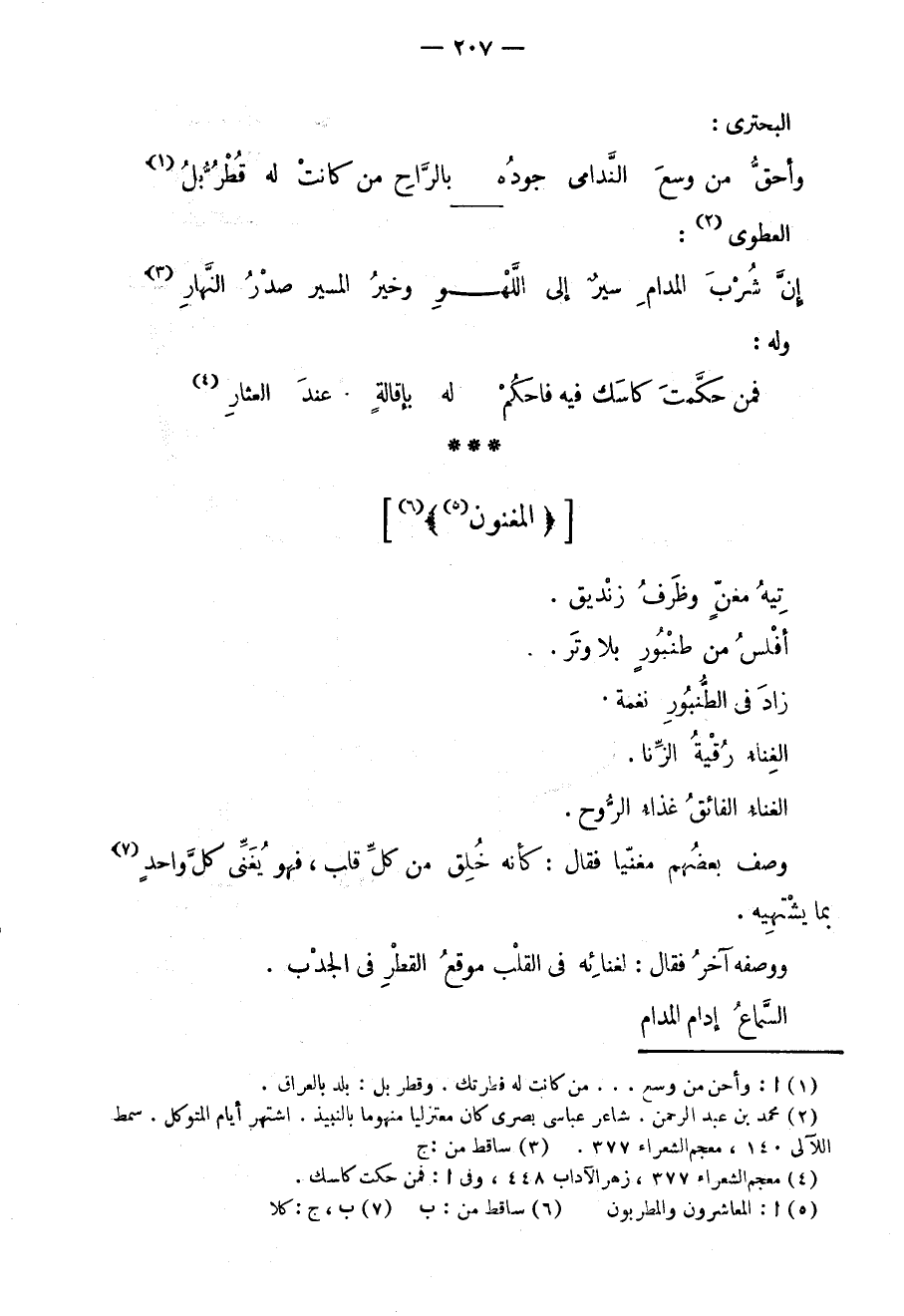تيه مغنٍ وظرف زنديق. أفلس من طنبورٍ بلا وتر. زاد في الطنبور نغمة. الغناء رقية الزنا. الغناء الفائق غذاء الروح. وصف بعضهم مغنياً فقال: كأنه خلق من كل قلب، فهو يغني كل واحدٍ بما يشتهيه. ووصفه آخر فقال: لغنائه في القلب موقع القطر في الجدب. السمّاع إدام المدام.