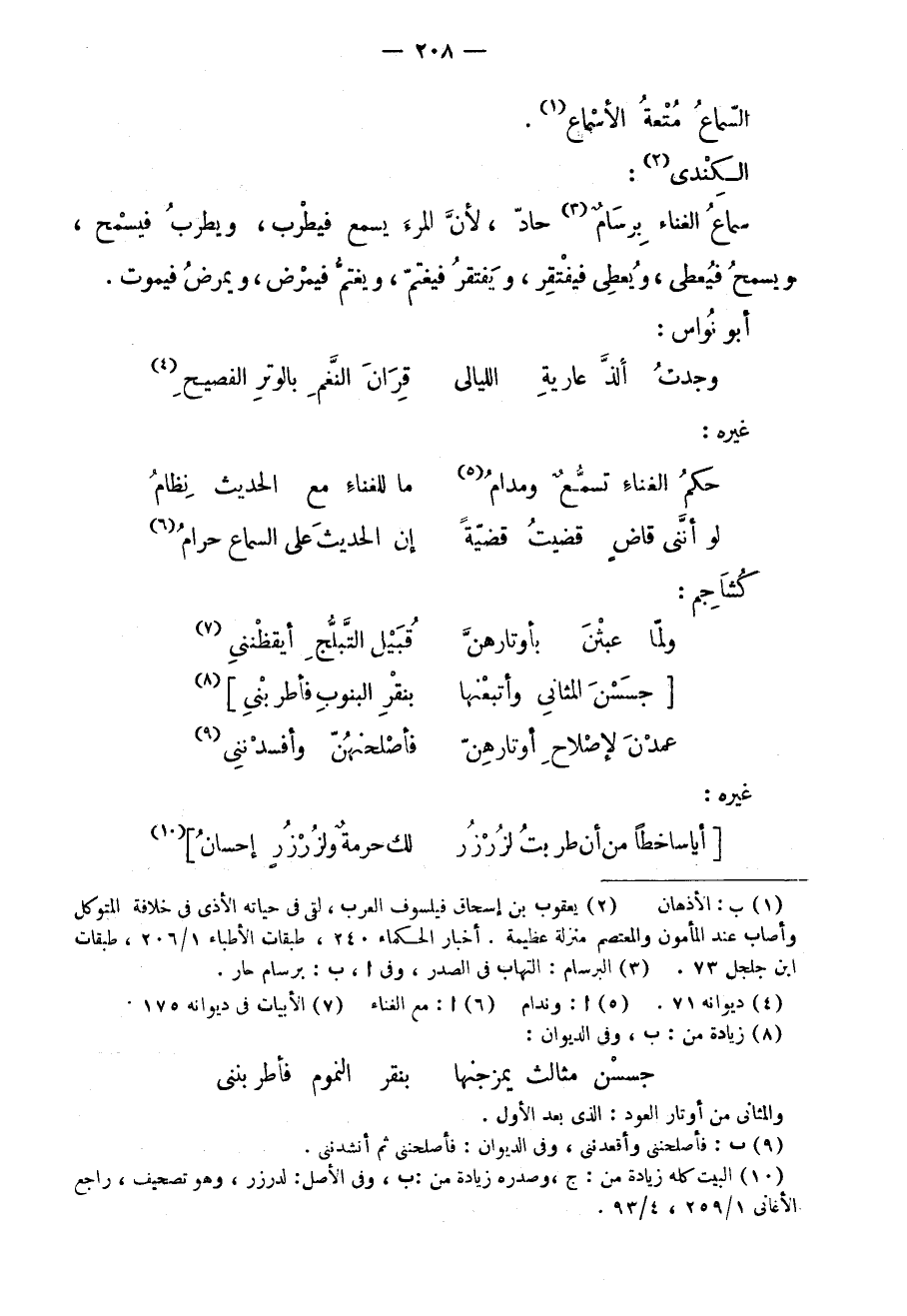 السمّاع متعة الأسماع. الكندي: سماع الغناء برسامٌ حاد، لأن المرء يسمع فيطرب، ويطرب فيسمح، ويسمح فيعطي، ويعطي فيفتقر، ويفتقر فيغتم، ويغتم فيمرض، ويمرض فيموت. أبو نواس: