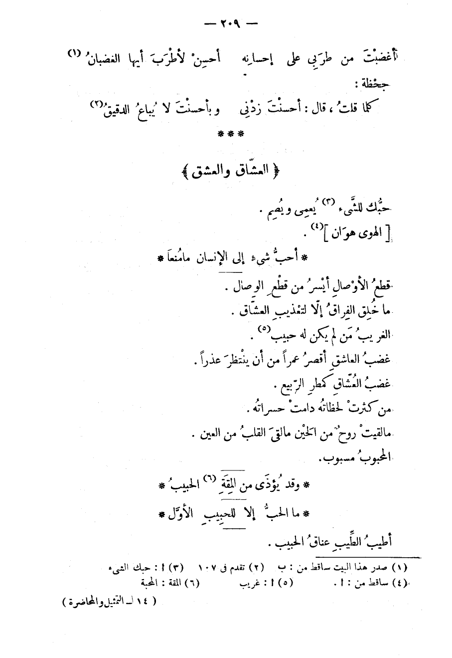 قطع الأوصال أيسر من قطع الوصال. ما خلق الفراق إلا لتعذيب العشاق. الغريب من لم يكن له حبيب. غضب العاشق أقصر عمراً من أن ينتظر عذراً. غضب العشاق كمطر الربيع. من كثرت لحظاته دامت حسراته. ما لقيت روحٌ من الحين ما لقي القلب من العين. المحبوب مسبوب.