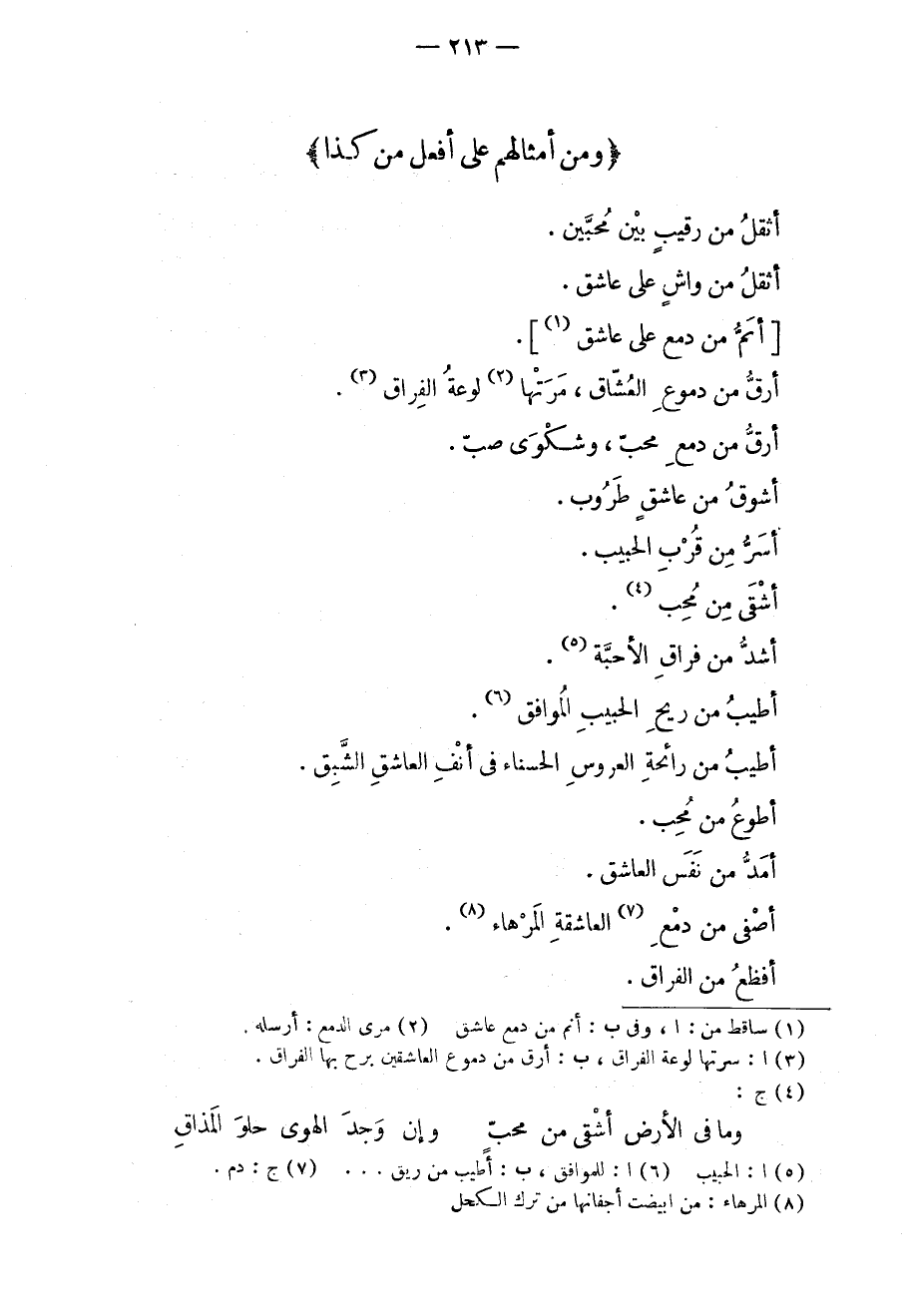 أثقل من رقيبٍ بين محبين. أثقل من واشٍ على عاشق. أنمّ من دمع على عاشق. أرق من دموع العشاق، مرتها لوعة الفراق. أرق من دمع محبٍ، وشكوى صب. أشوق من عاشق طروب. أسر من قرب الحبيب. أشقى من محب. أشد من فراق الأحبة. أطيب من ريح الحبيب الموافق. أطيب من رائحة العروس الحسناء في أنف العاشق الشبق. أطوع من محب. أمد من نفس العاشق. أصفى من دمع العاشقة المرهاء. أفظع من الفراق.