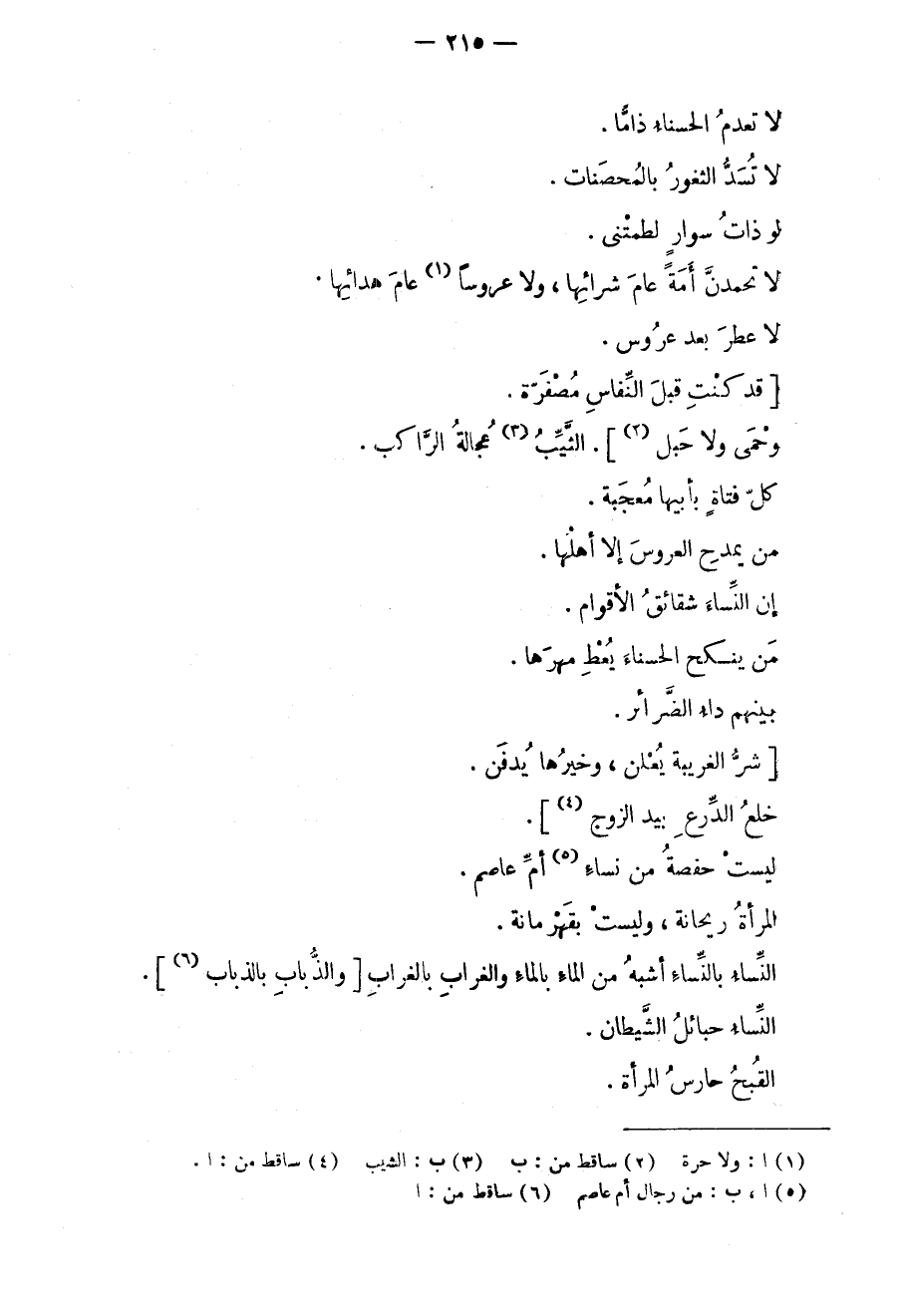 لا تعدم الحسناء ذاماً. لا تسد الثغور بالمحصنات. لو ذات سوارٍ لطمتني. لا تحمدنّ أمةً عام شرائها، ولا عروساً عام هدائها. لا عطر بعد عروس. قد كنت قبل النفاس مصفرة. وحمى ولا حبل. الثيب عجالة الراكب. كل فتاةٍ بأبيها معجبة. من يمدح العروس إلا أهلها. إن النساء شقائق الأقوام. من ينكح الحسناء يعط مهرها. بينهم داء الضرائر. شر الغريبة يعلن، وخيرها يدفن. خلع الدرع بيد الزوج. ليست حفصة من نساء أم عاصم. المرأة ريحانة، وليست بقهرمانة. النساء بالنساء أشبه من الماء والغراب بالغراب والذباب بالذباب. النساء حبائل الشيطان. القبح حارس المرأة.