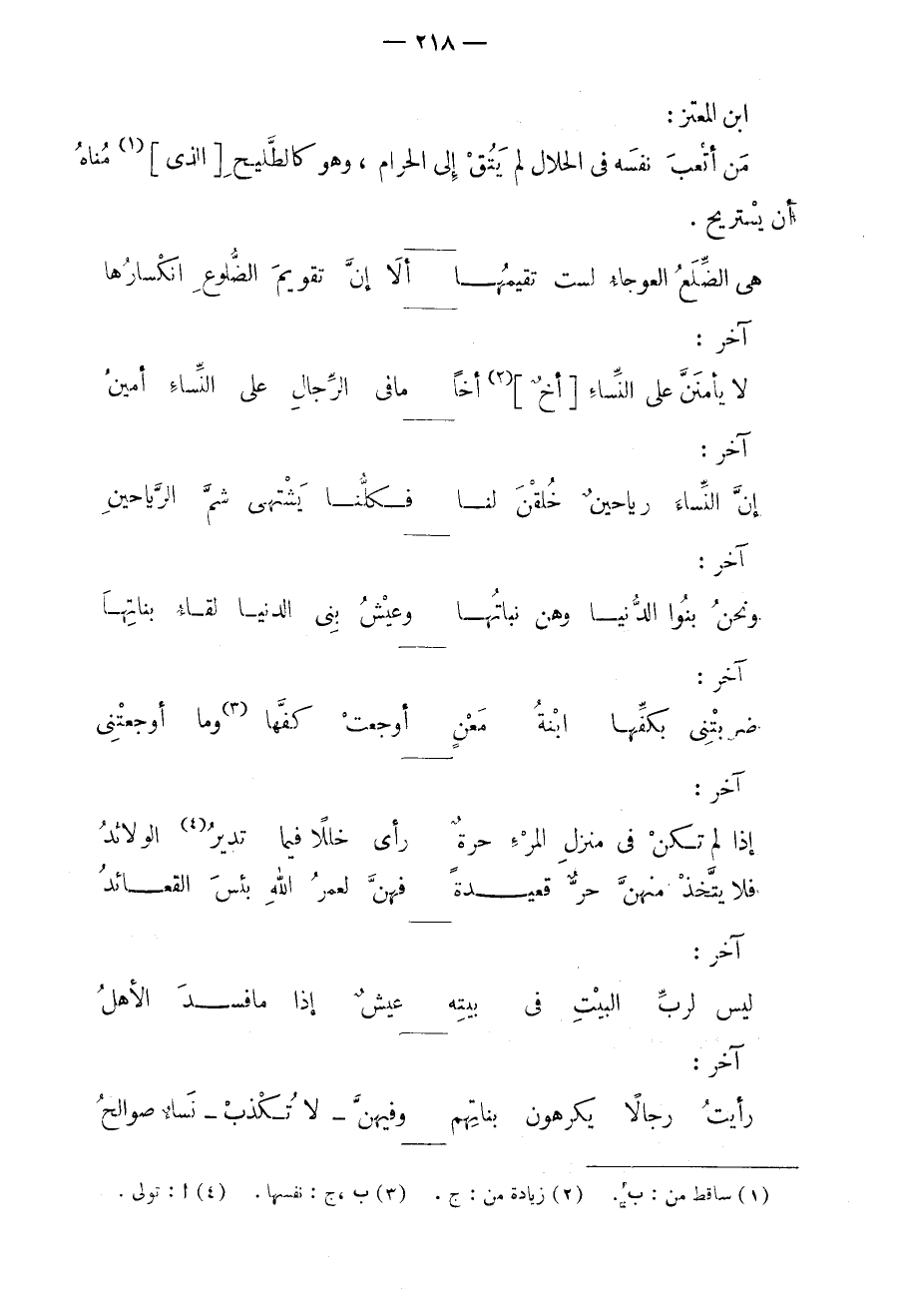 ابن المعتز: من أتعب نفسه في الحلال لم يتق إلى الحرام، وهو كالطليح الذي مناه أن يستريح.