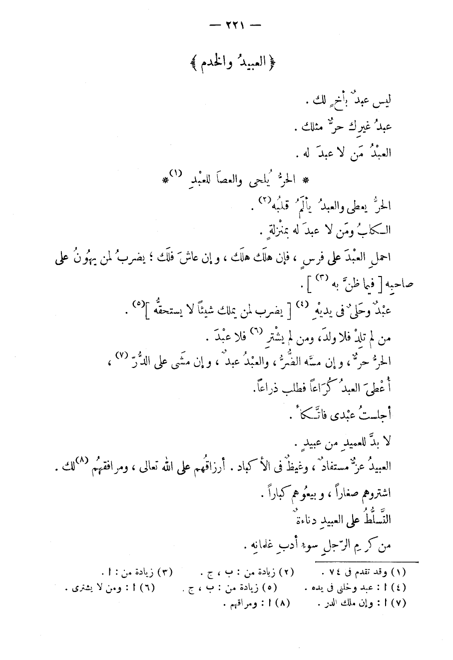 الحر يعطي والعبد يألم قلبه. الكلب ومن لا عبد له بمنزلةٍ. احمل العبد على فرسٍ، فإن هلك هلك، وإن عاش فلك؛ يضرب لمن يهون على صاحبه فيما ظن به. عبدٌ وحليٌ في يديه؛ يضرب لمن يملك شيئاً لا يستحقه. من لم تلد فلا ولد، ومن لم يشتر فلا عبد. الحر حرٌ، وإن مسه الضر، والعبد عبدٌ، وإن مشى على الدر. أعطي العبد كراعاً فطلب ذراعاً. أجلست عبدي فاتكأ. لا بد للعميد من عبيد. العبيد عزٌ مستفادٌ، وغيظٌ في الأكباد. أرزاقهم على الله تعالى، ومرافقهم لك. اشتروهم صغاراً، وبيعوهم كباراً. التسلط على العبيد دناءةٌ. من كرم الرجل سوء أدب غلمانه.