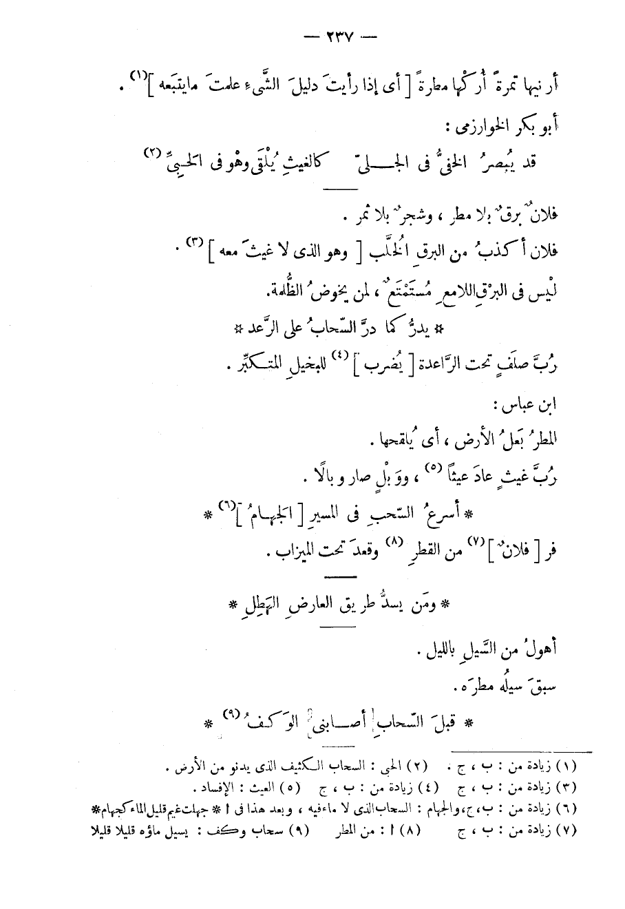 ربّ صلفٍ تحت الراعدة يضرب للبخيل المتكبر. ابن عباس: المطر بعل الأرض، أي يلقحها. ربّ غيثٍ عاد عيثاً، ووبلٍ صار وبالاً.
