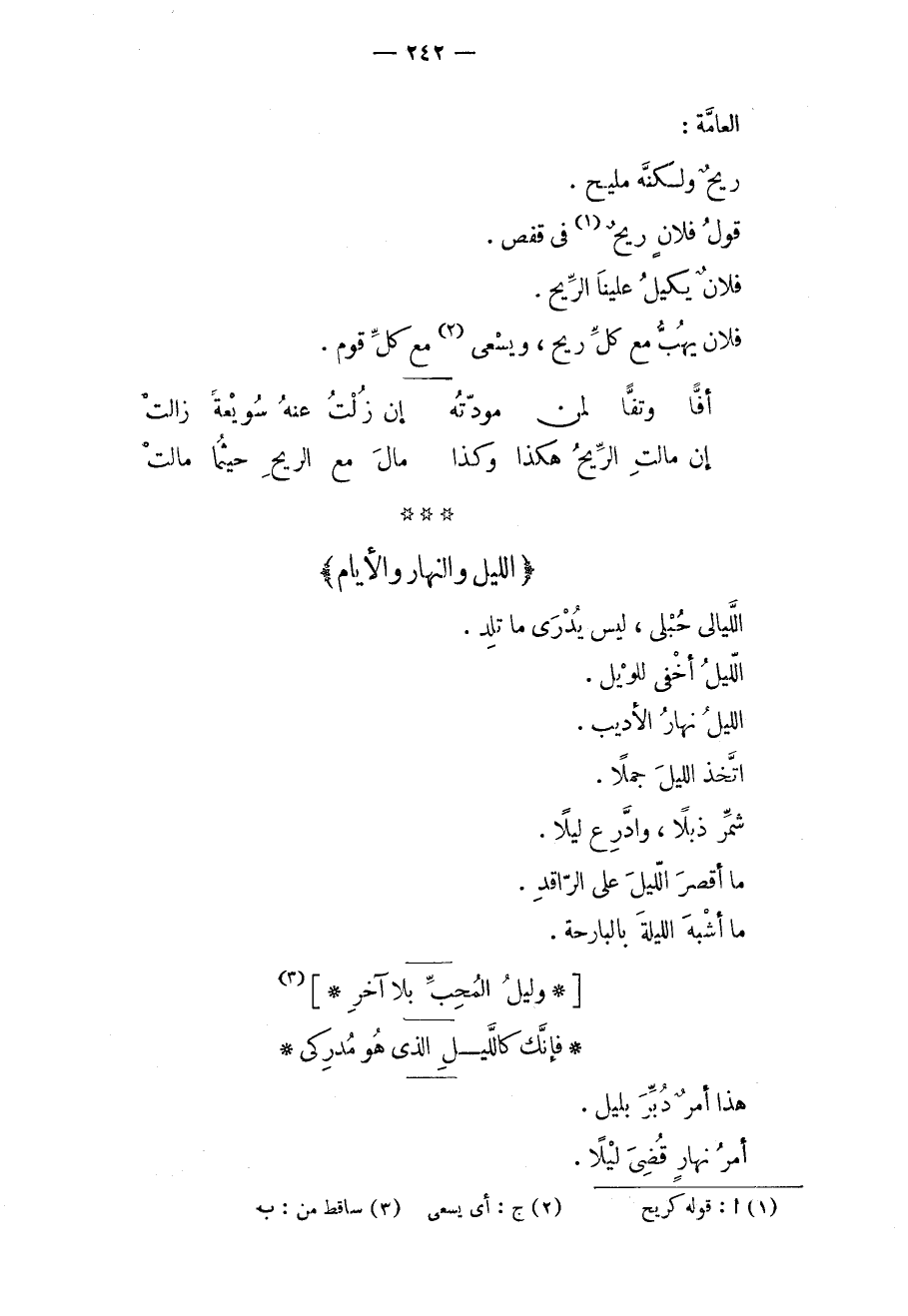 الليالي حبلى، ليس يدرى ما تلد. الليل أخفى للويل. الليل نهار الأديب. اتخذ الليل جملاً. شمر ذبلاً، وادرع ليلاً. ما أقصر الليل على الراقد. ما أشبه الليلة بالبارحة.