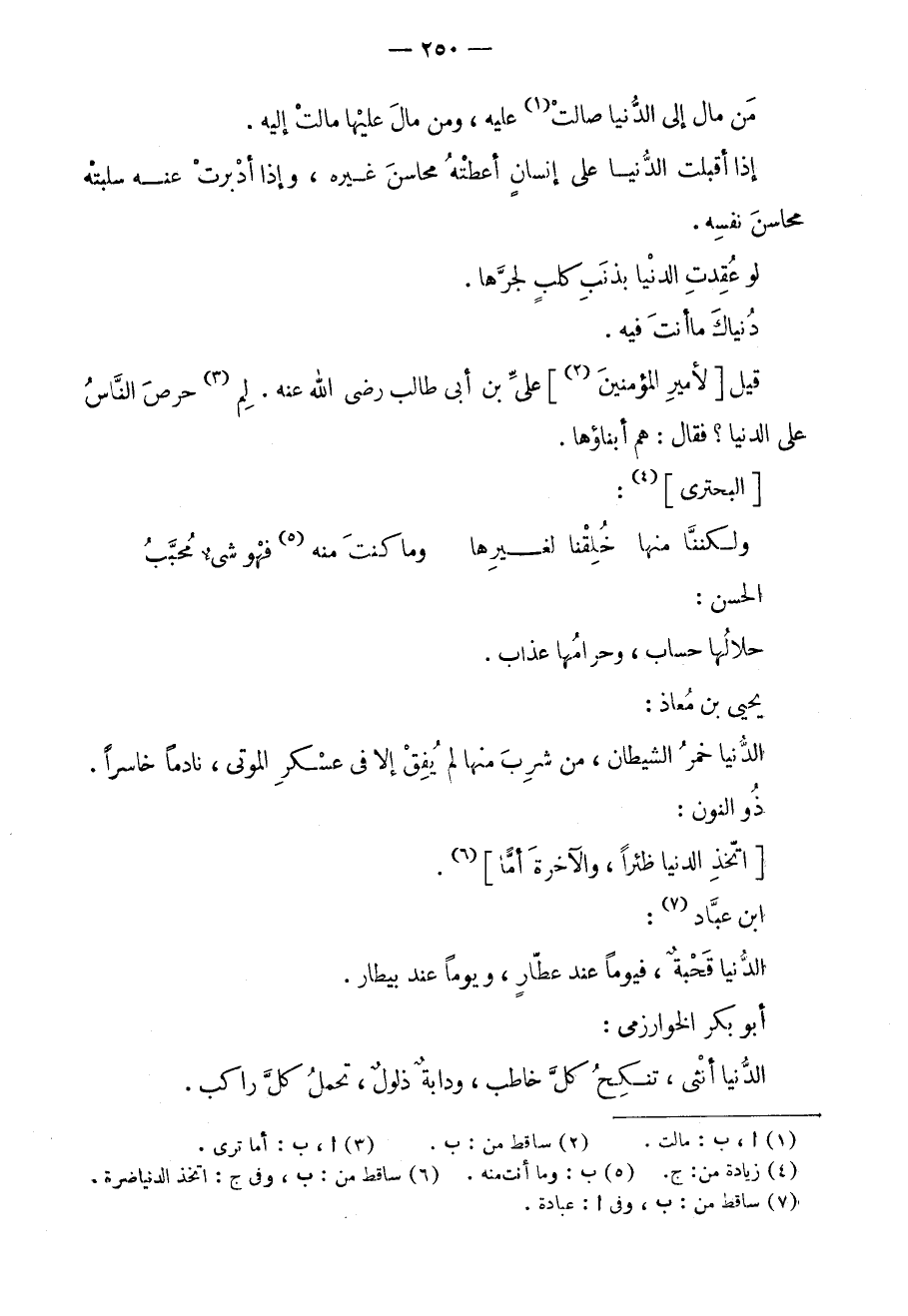 الحسن: حلالها حساب، وحرامها عذاب. يحيى بن معاذ: الدنيا خمر الشيطان، من شرب منها لم يفق إلا في عسكر الموتى، نادماً خاسراً. ذو النون: اتخذ الدنيا ظئراً، والآخرة أماً. ابن عباد: الدنيا قحبةٌ، فيوماً عند عطار، ويوماً عند بيطار. أبو بكر الخوارزمي: الدنيا أنثى، تنكح كل خاطب، ودابة ذلول، تحمل كل راكب.