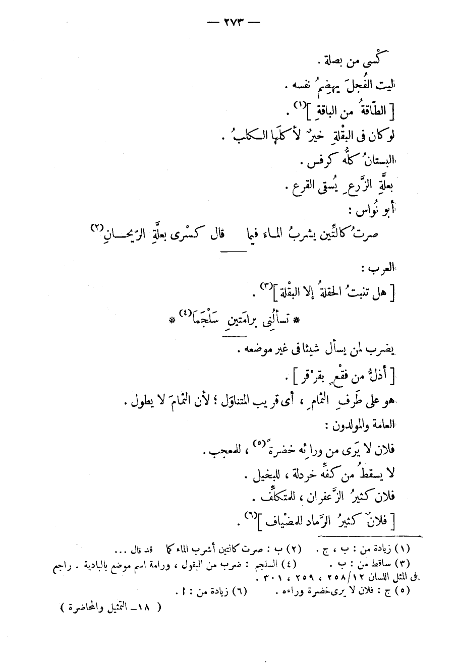 كسي من بصلة. ليت الفجل يهضم نفسه. الطاقة من الباقة. لو كان في البقلة خيرٌ لأكلها الكلب. البستان كله كرفس. بعلّة الزرع يسقى القرع. أبو نواس:
